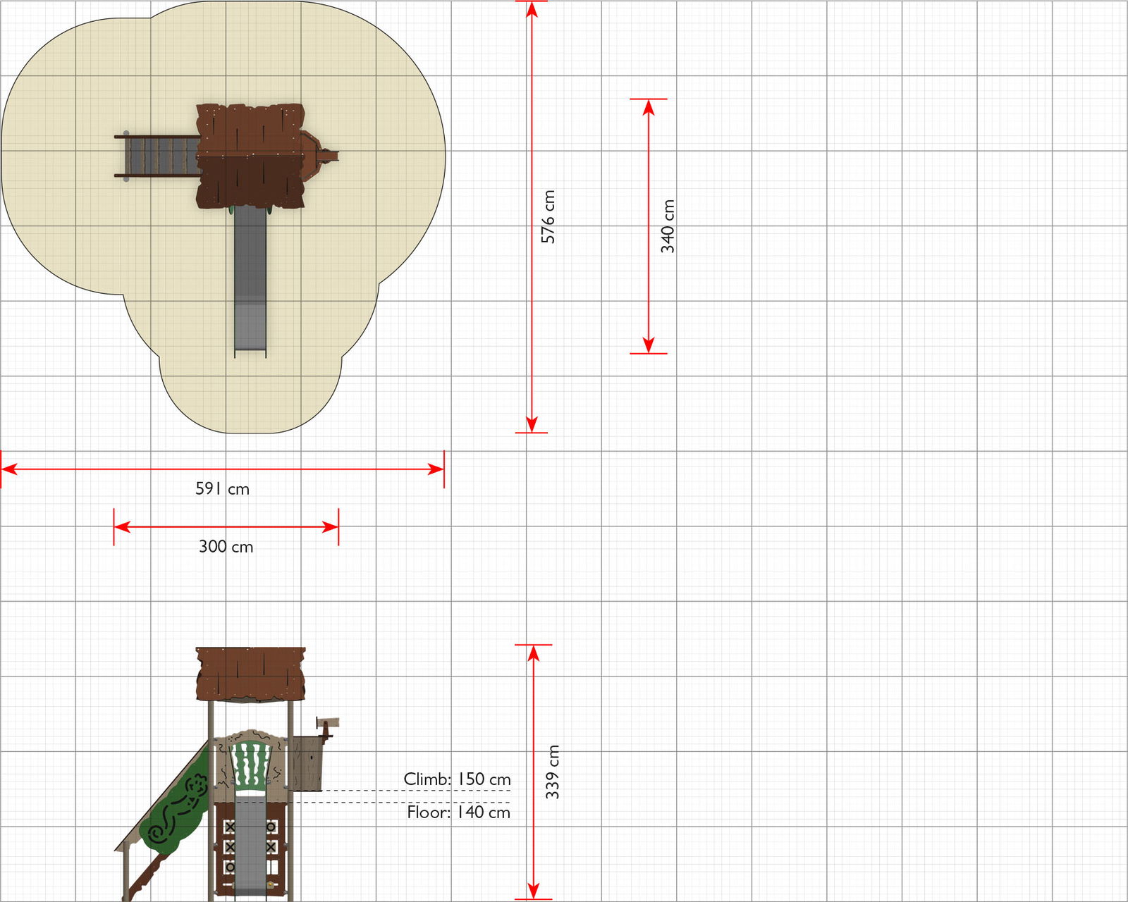 - Platzbedarf inkl. Sicherheitsabstände (LxB): 576 x 591 cm