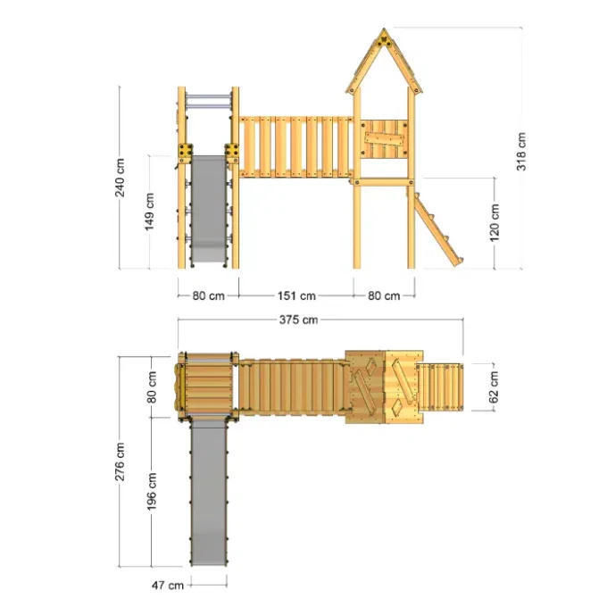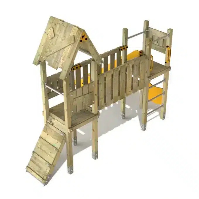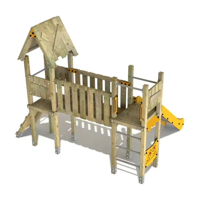 - Kletterleitern mit Edelstahlsprossen und eine Holzbrücke fördern das Klettern und den Gleichgewichtssinn.