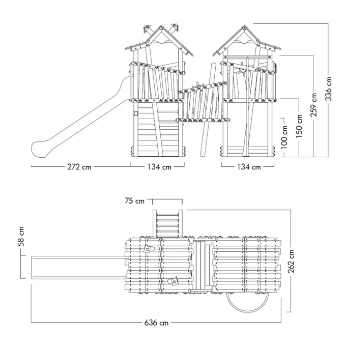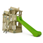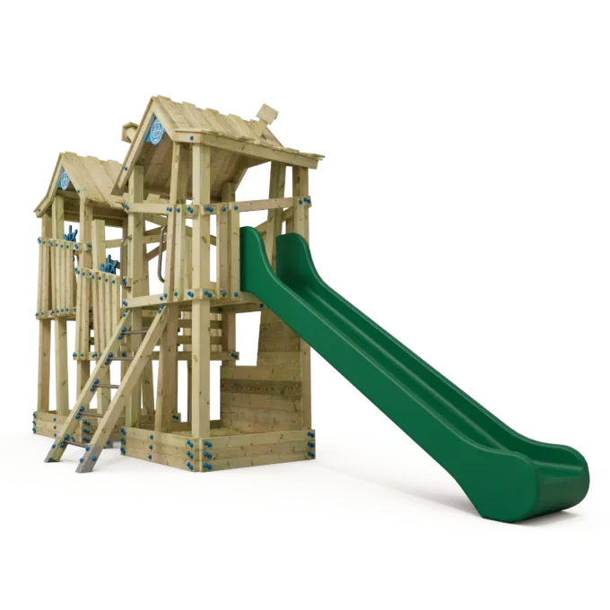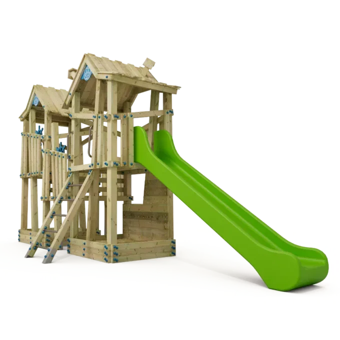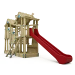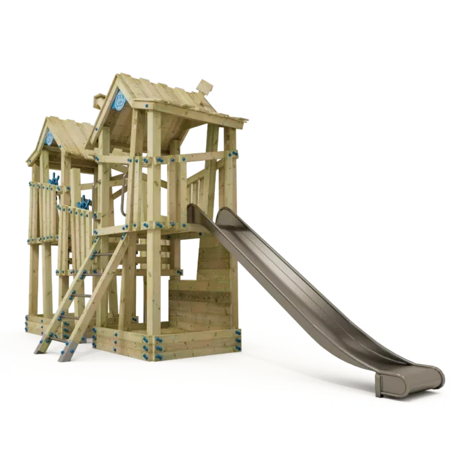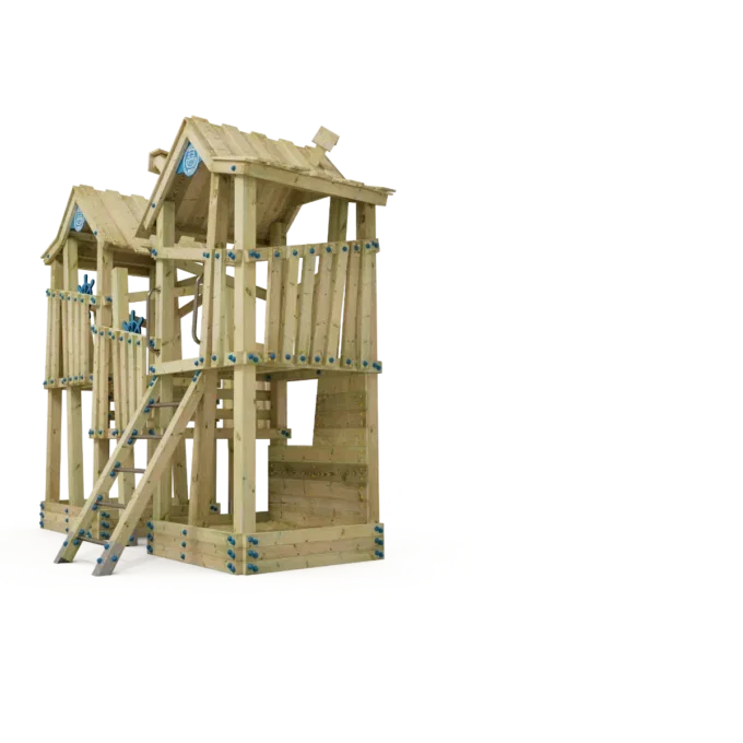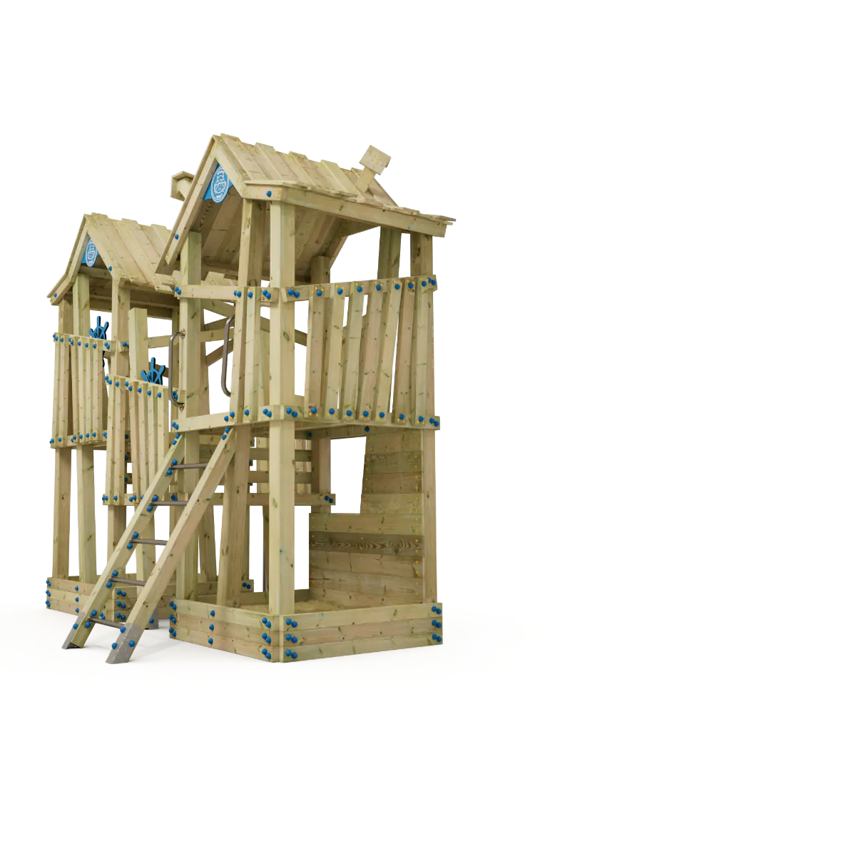 Die Kletterleiter mit stabilen, feuerverzinkten Sprossen hilft den Kindern, den hohen Turm zu erklimmen und die Aussicht über den Spielplatz zu genießen. Die schräge Ausführung und die zwei integrierten Schornsteine verleihen dem Spielturm ein fantasievolles Design, das die Vorstellungskraft anregt und die Kinder ermutigt, in unterschiedliche Rollen zu schlüpfen – sei es als mutige Ritter, tapfere Feuerwehrleute oder abenteuerlustige Entdecker. Langeweile hat mit dem GIANT Residence keine Chance!
