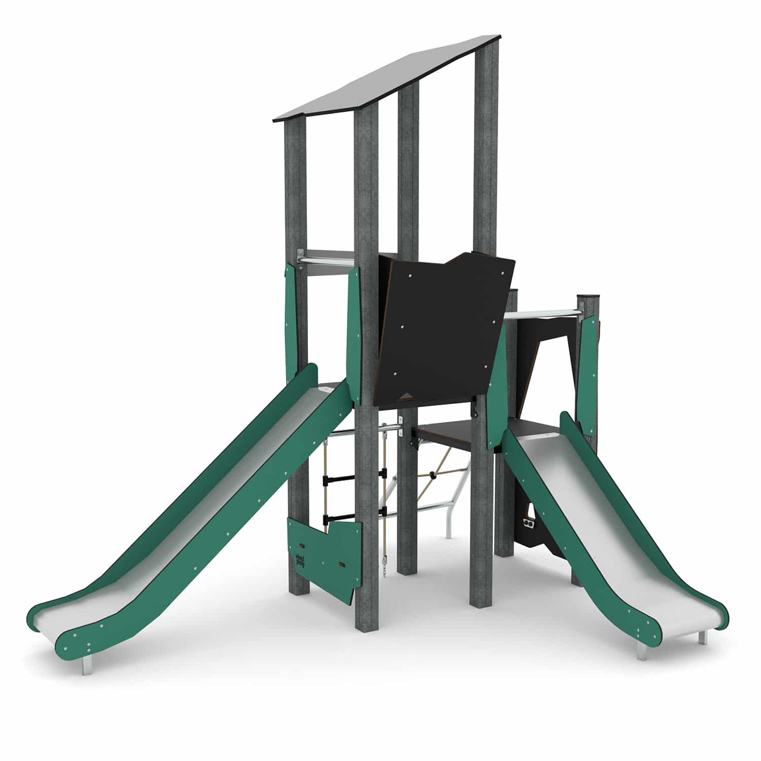 Materialangabe Spielturm mit Kletterelementen und 2 Rutschen und Plattformen RECYCLED RC1406 von Vinci Play
