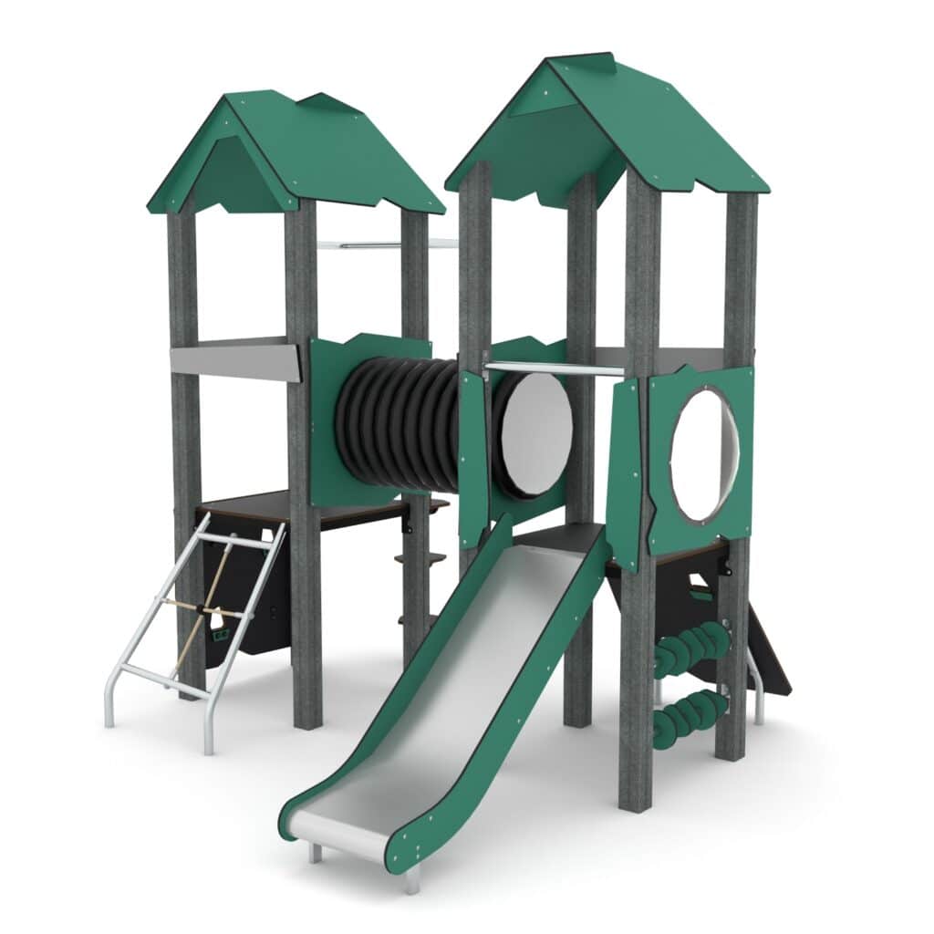 Spielturm mit Kriechtunnel, Kletterelementen, Rutsche und 2 Plattformen RECYCLED RC1407 von Vinci Play