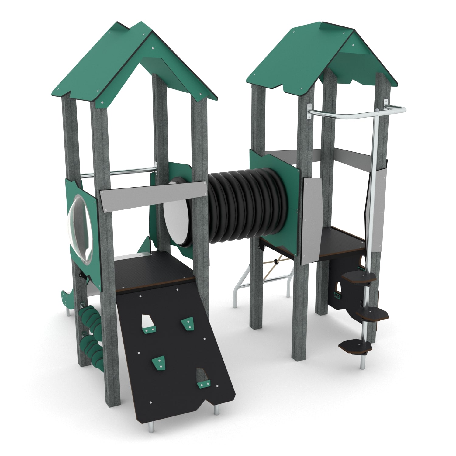 Technische Daten Spielturm mit Kriechtunnel, Kletterelementen, Rutsche und 2 Plattformen RECYCLED RC1407 von Vinci Play