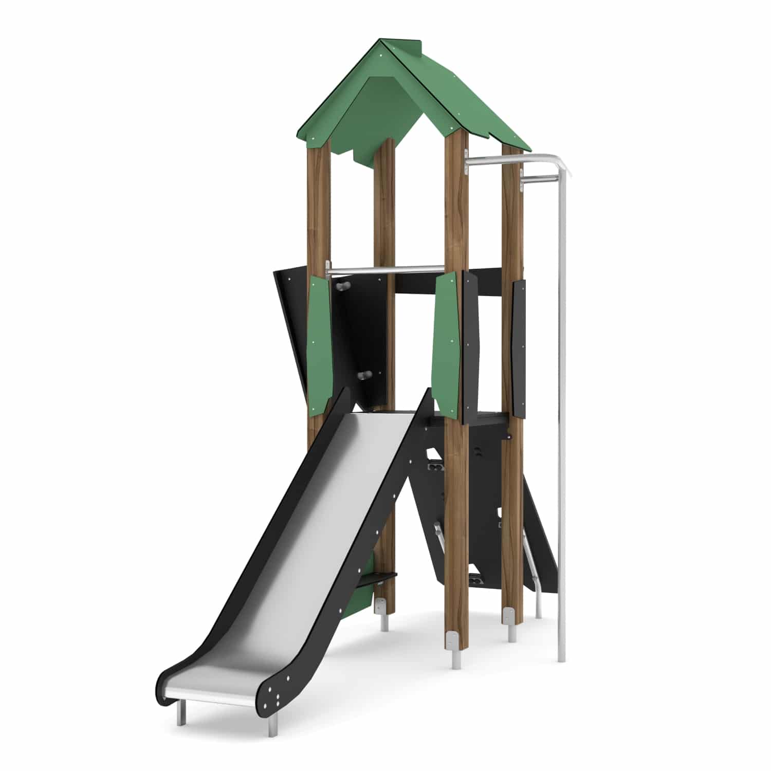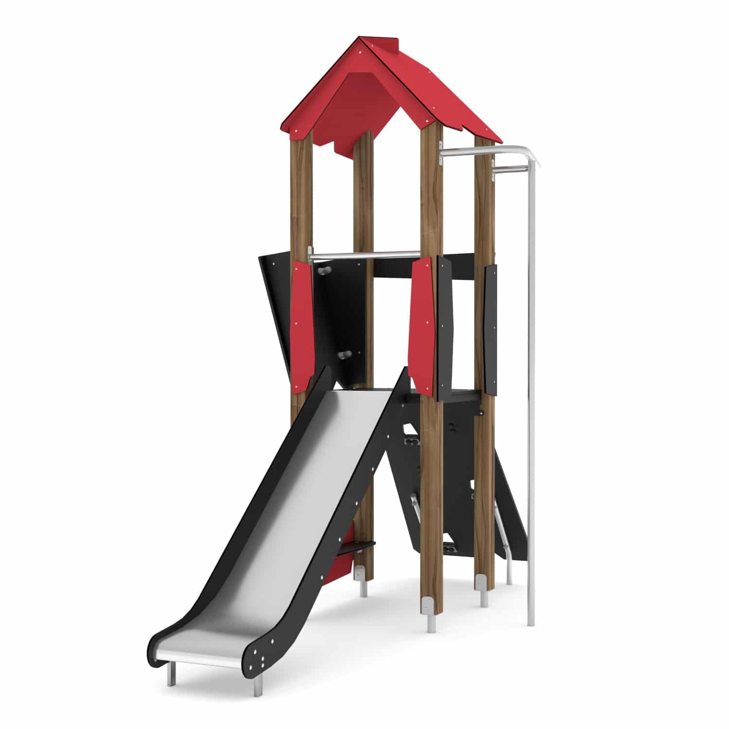 - Rutschen aus Edelstahl mit strapazierfähigen Seitenteilen aus HDPE oder HPL, Feuerwehrstange aus Edelstahl,