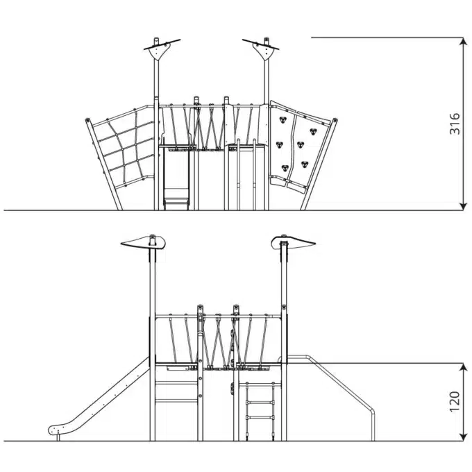 - Podeste und Kletterwände aus dauerhaft rutschfestem und wasserfestem HPL-Plattenmaterial,