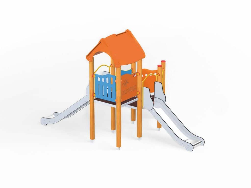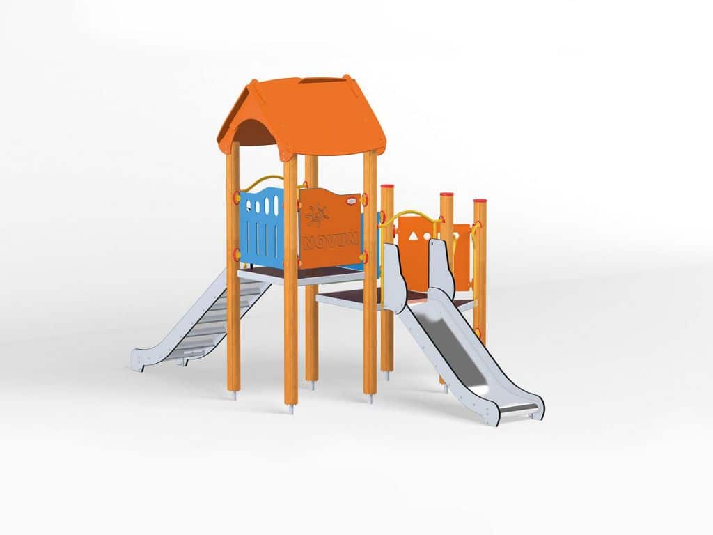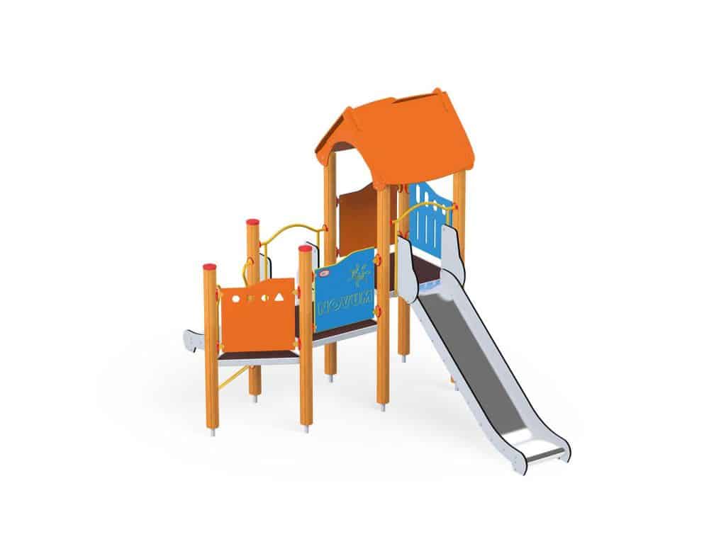 - Material Variante Holz: Imprägniertes, verleimtes Holz mit Längsfräsungen. Paneele aus HDPE. Verzinkte und pulverbeschichtete Metallelemente. Rutschbahn aus Edelstahl.