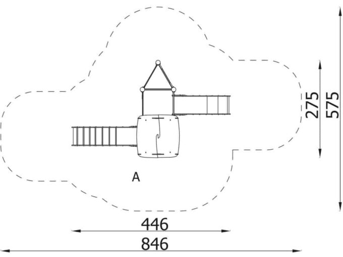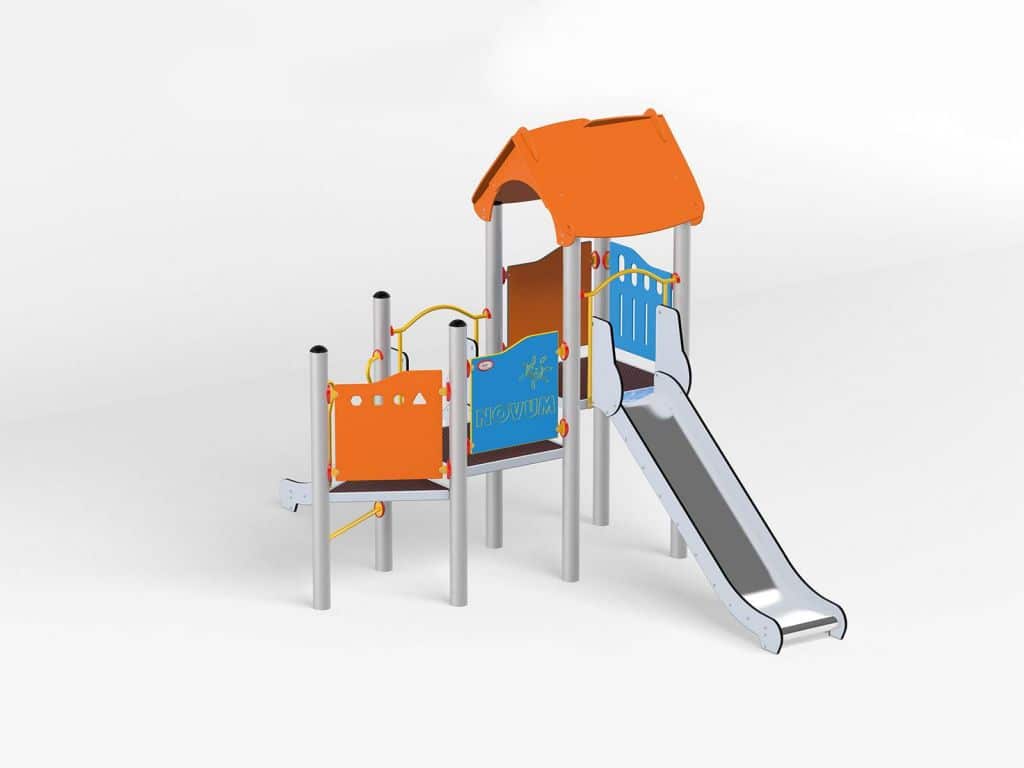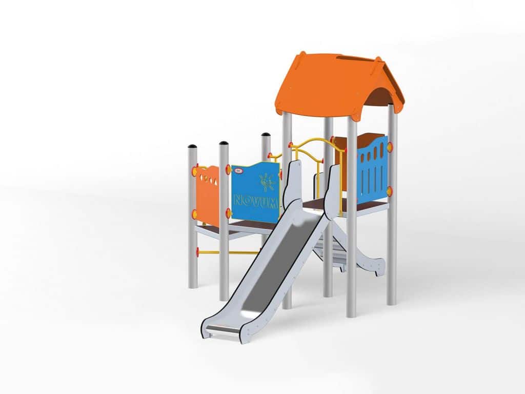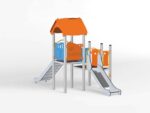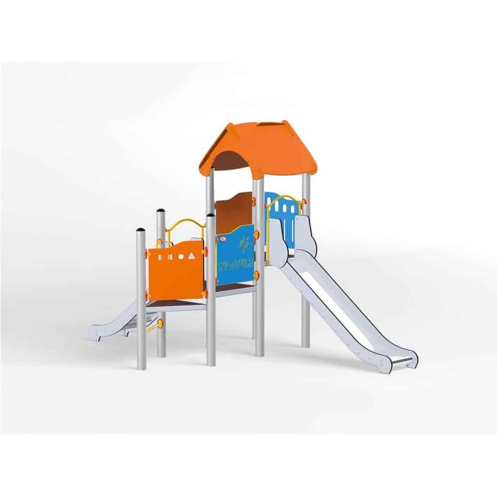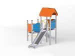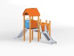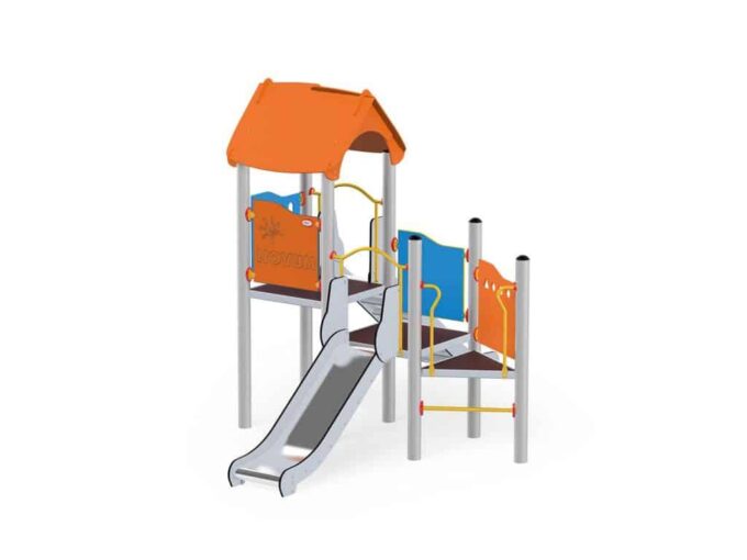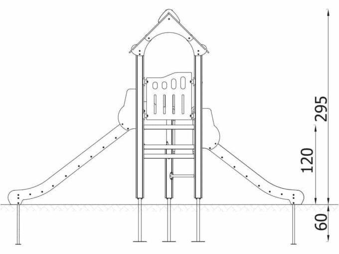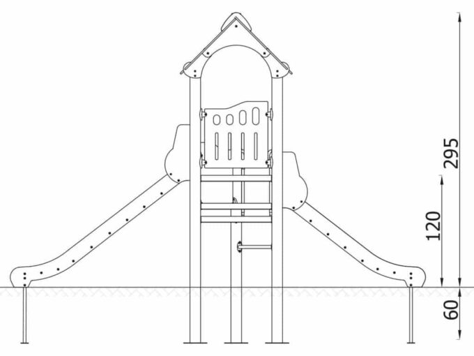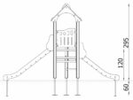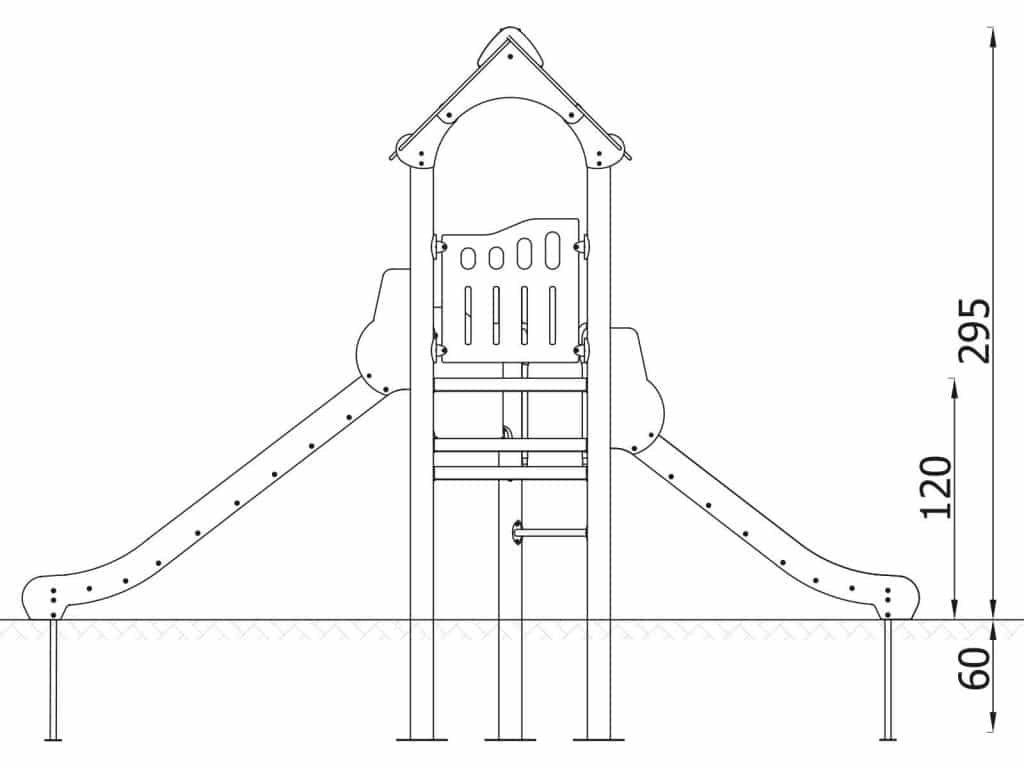 - Material Variante Metall: Die Tragpfosten bestehen aus runden Stahlrohren mit einem Durchmesser von 114 cm, die direkt im Boden befestigt werden. Rutschfeste Plattformen. Dächer, Sicherheitselemente und Paneele werden aus HDPE-Platten (High Durable Polyethylen) mit Musterzuschnitten hergestellt. Gleitfläche aus säurebeständigem Edelstahlblech. Seile aus Polypropylen mit Stahlkern, Stärke 16-18 mm, vandalismus- und UV-beständig. Alle Fittings und Anschlüsse sind witterungs- und UV-beständig. Stahlelemente sind durch Zinkschicht und Pulverlackierung gegen Korrosion geschützt.