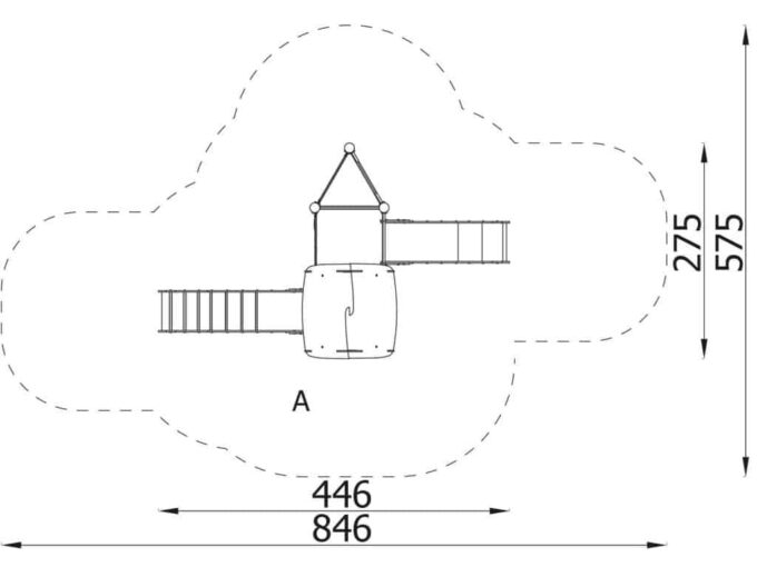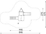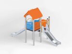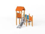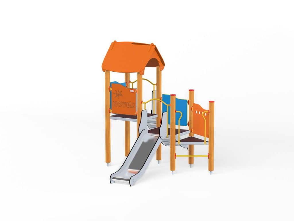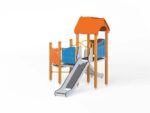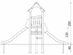 Turm 10 Artikelnr. 1137 Spielturm mit einem Satteldach, einem dreieckigen Podest, einem quadratischen Podest, einer Rutsche, einem Einstieg. Diese Spielanlage ist auch mit feuerverzinktem Pfosten erhältlich.