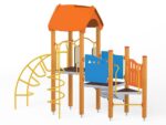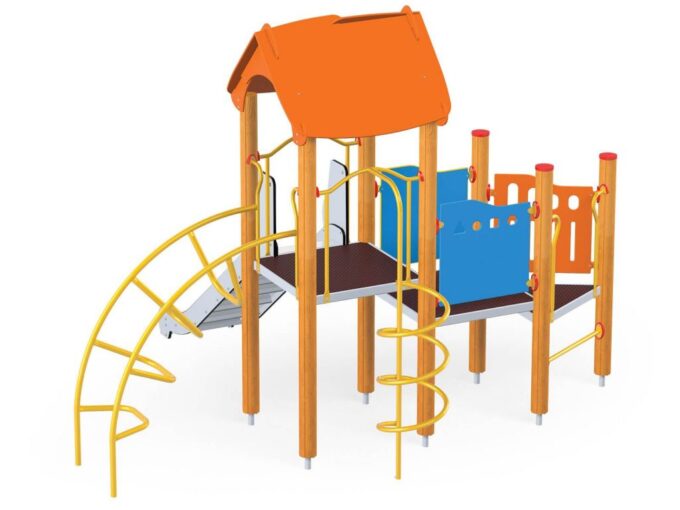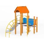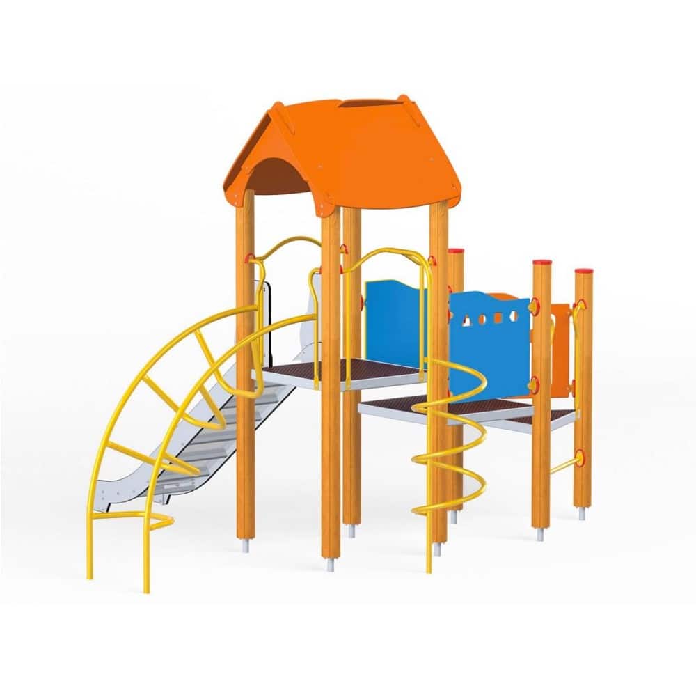 Turm 11 Artikelnr. 1138 Spielturm mit Satteldach, dreieckigem Podest, quadratischem POdest, einer Rutsche, einem Bogenaufstieg, einem Spiralaufstieg, einem Einstieg.