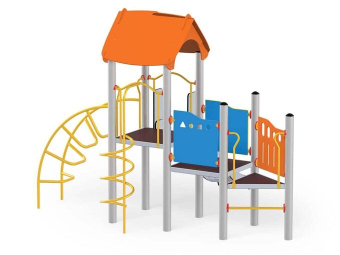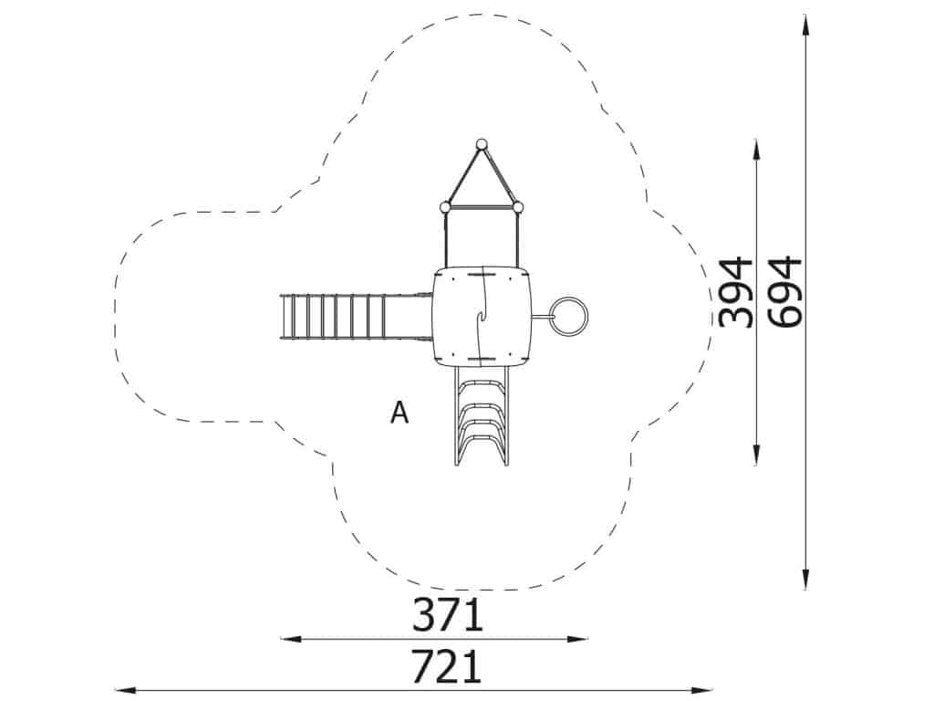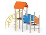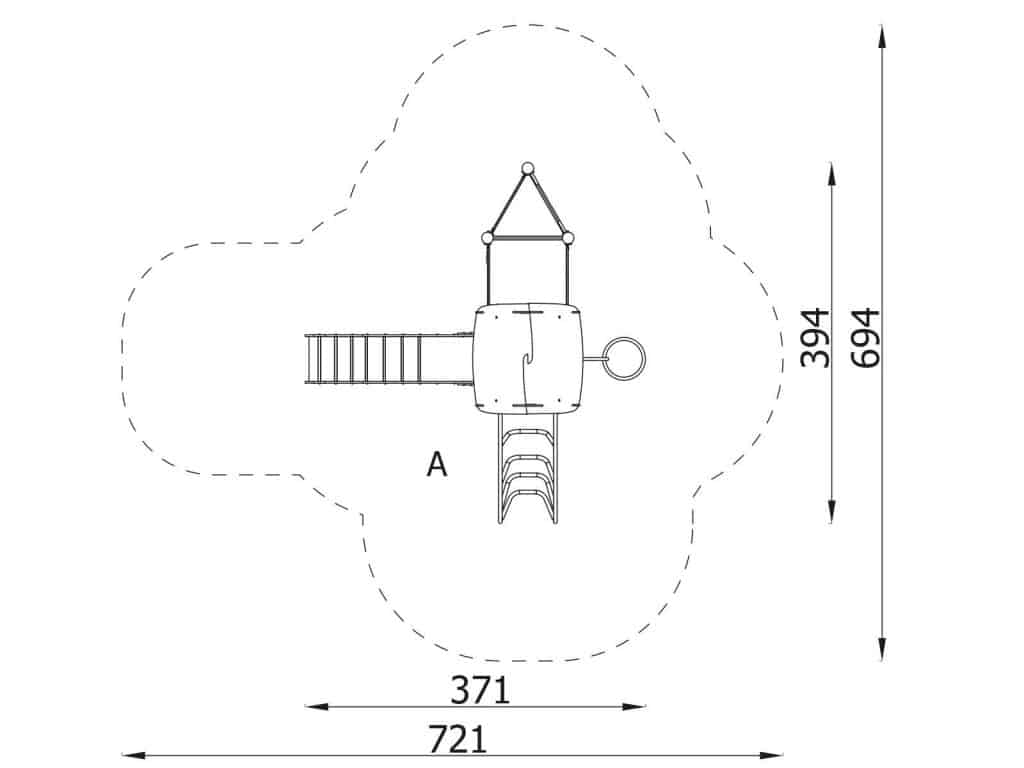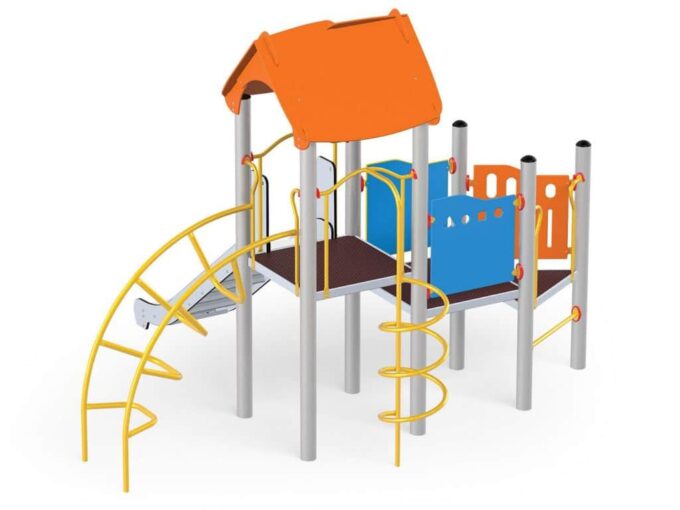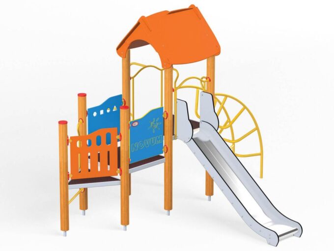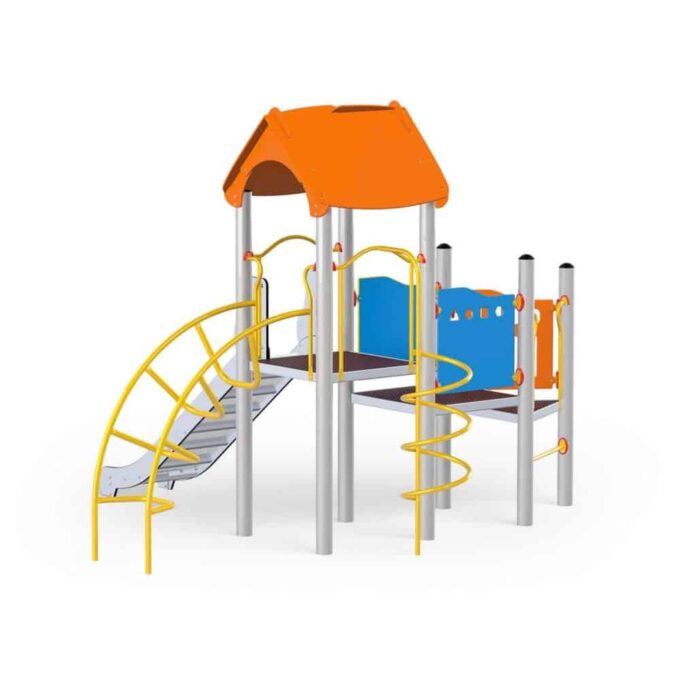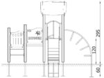 - Material Variante Metall: Die Tragpfosten bestehen aus runden Stahlrohren mit einem Durchmesser von 114 cm, die direkt im Boden befestigt werden. Rutschfeste Plattformen. Dächer, Sicherheitselemente und Paneele werden aus HDPE-Platten (High Durable Polyethylen) mit Musterzuschnitten hergestellt. Gleitfläche aus säurebeständigem Edelstahlblech. Seile aus Polypropylen mit Stahlkern, Stärke 16-18 mm, vandalismus- und UV-beständig. Alle Fittings und Anschlüsse sind witterungs- und UV-beständig. Stahlelemente sind durch Zinkschicht und Pulverlackierung gegen Korrosion geschützt.