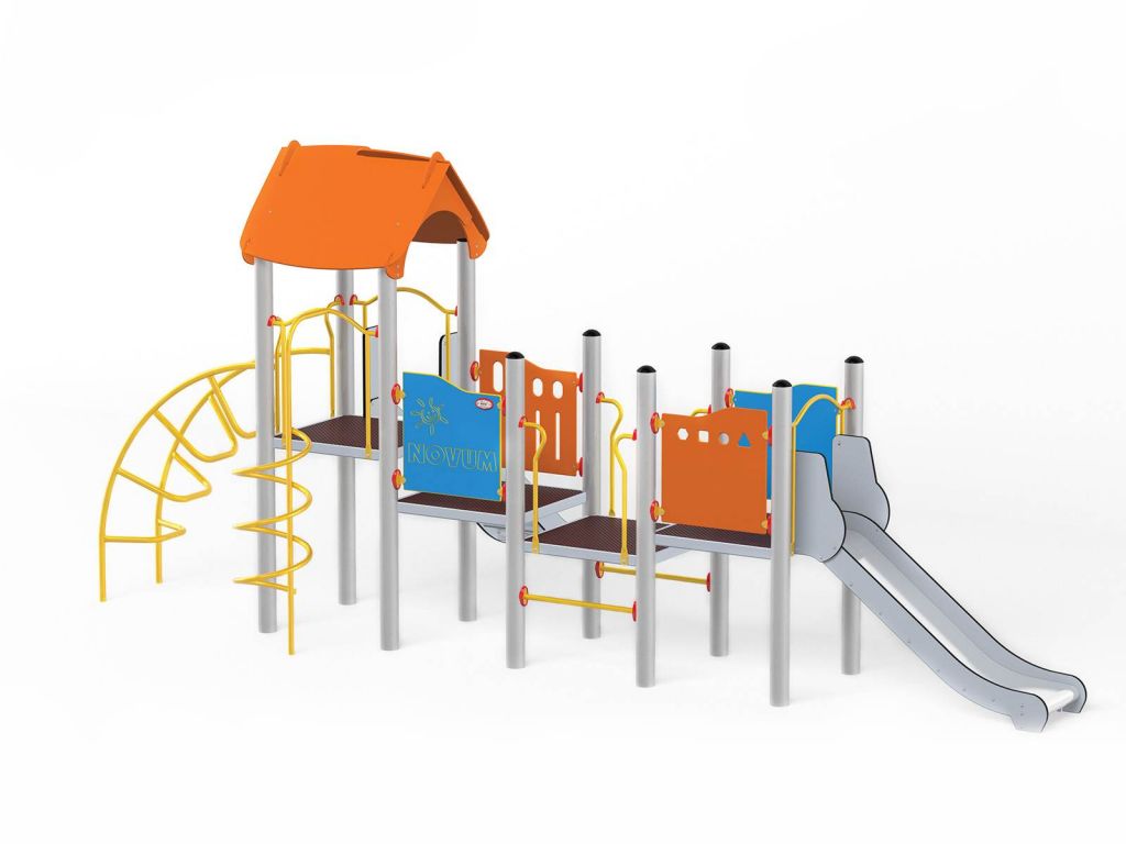 - Material Variante Metall: Die Tragpfosten bestehen aus runden Stahlrohren mit einem Durchmesser von 114 cm, die direkt im Boden befestigt werden. Rutschfeste Plattformen. Dächer, Sicherheitselemente und Paneele werden aus HDPE-Platten (High Durable Polyethylen) mit Musterzuschnitten hergestellt. Gleitfläche aus säurebeständigem Edelstahlblech. Seile aus Polypropylen mit Stahlkern, Stärke 16-18 mm, vandalismus- und UV-beständig. Alle Fittings und Anschlüsse sind witterungs- und UV-beständig. Stahlelemente sind durch Zinkschicht und Pulverlackierung gegen Korrosion geschützt.