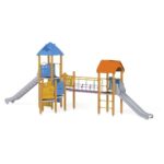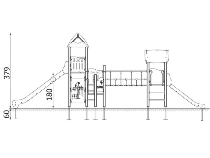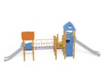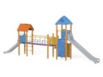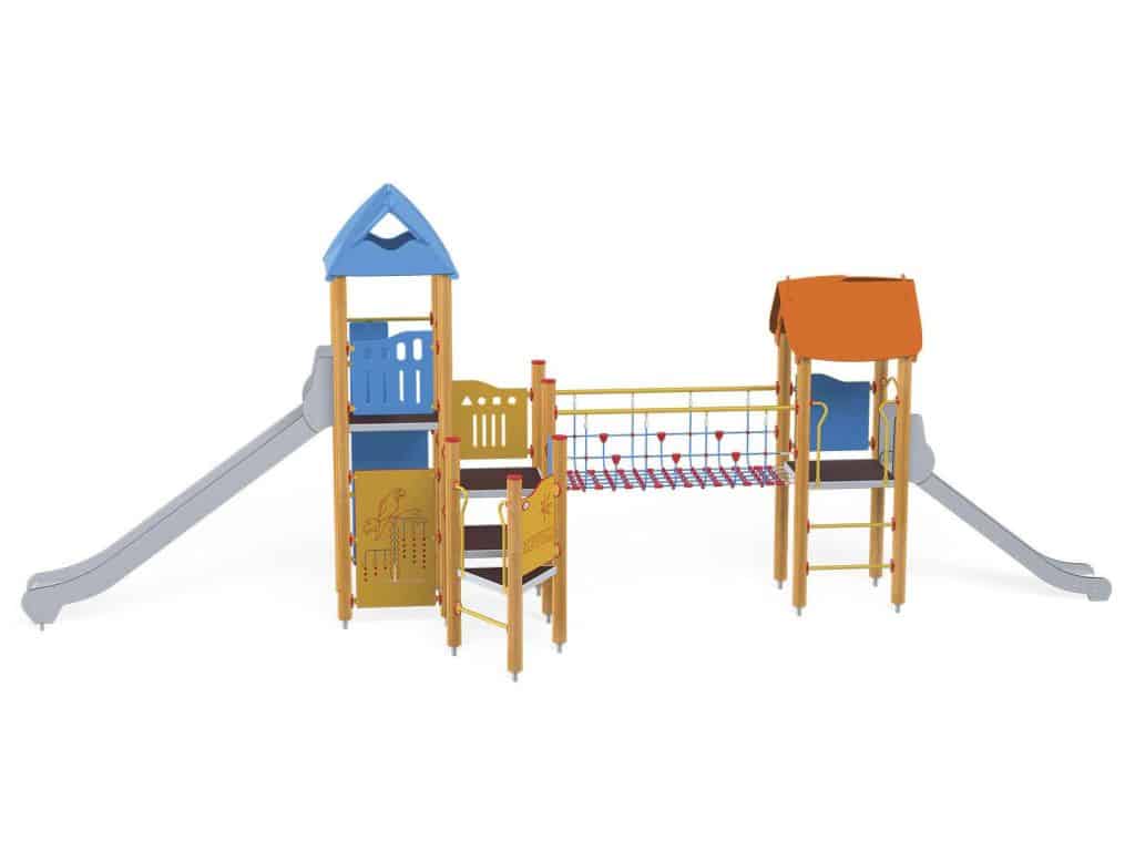 1 Turm mit Dach, 1 Turm mit Satteldach, 1 Dreiecksplattform, 2 quadratische Plattformen, 1 Rohrbrücke, 1 lange Rutsche, 1 tiefe Rutsche, 2 Wände mit dekorativen Einschnitten, 7 Sicherheits-HDPE-Platten mit dekorativen Einschnitten, 2 quadratische Podeste, 3 Eingang, 5 Kletterstangen, 2 Metallstangen über der Rutsche, 13 Metallbeschläge zum Einbau in den Boden