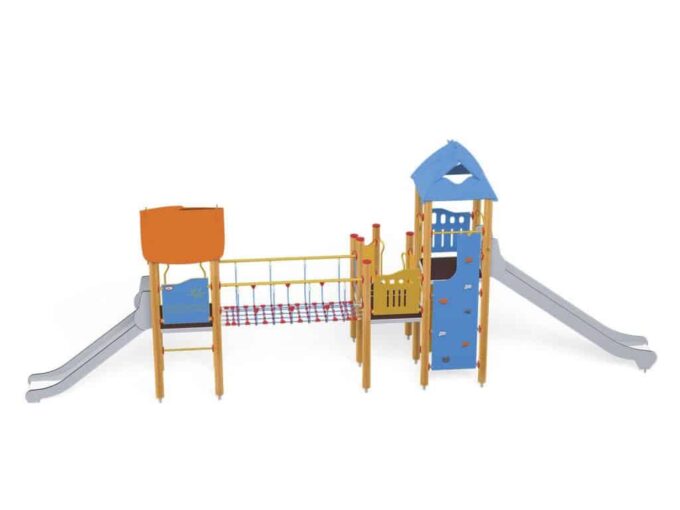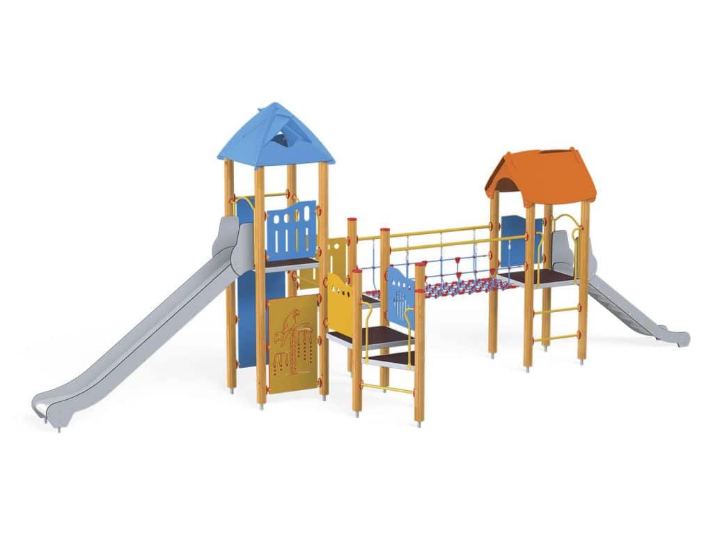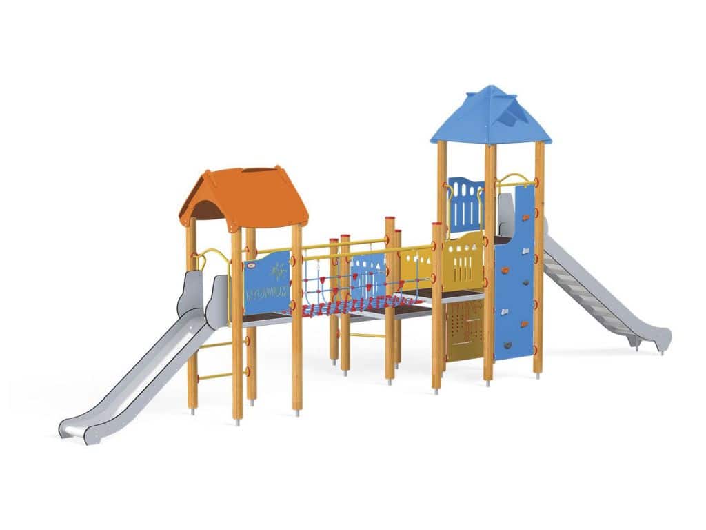 - Material: Imprägniertes, verleimtes Holz mit Längsfräsungen. Paneele aus HDPE. Verzinkte und pulverbeschichtete Metallelemente. Rutschbahn aus Edelstahl.