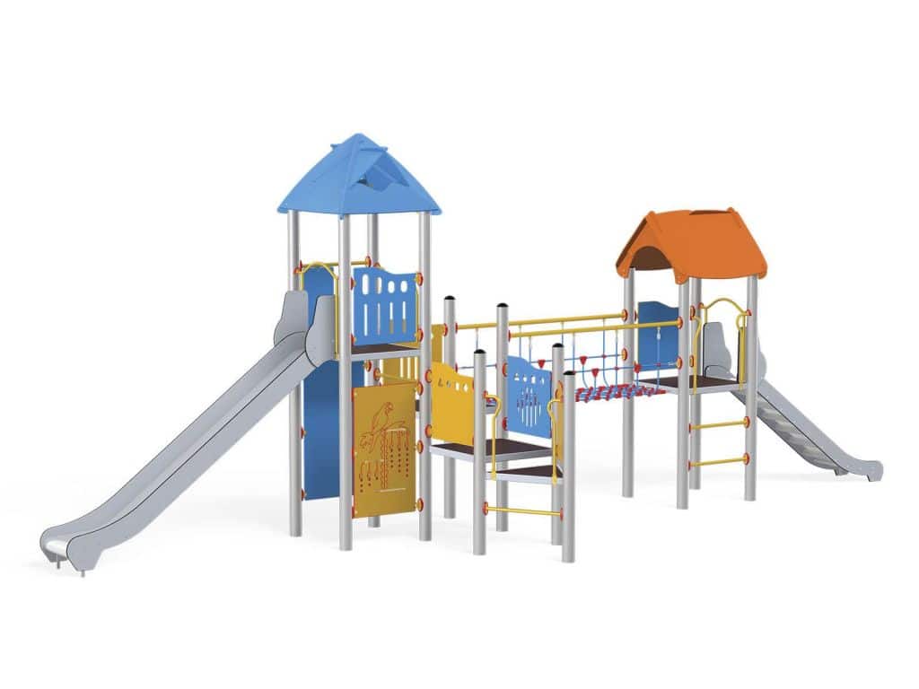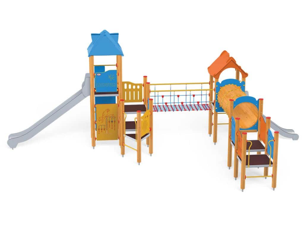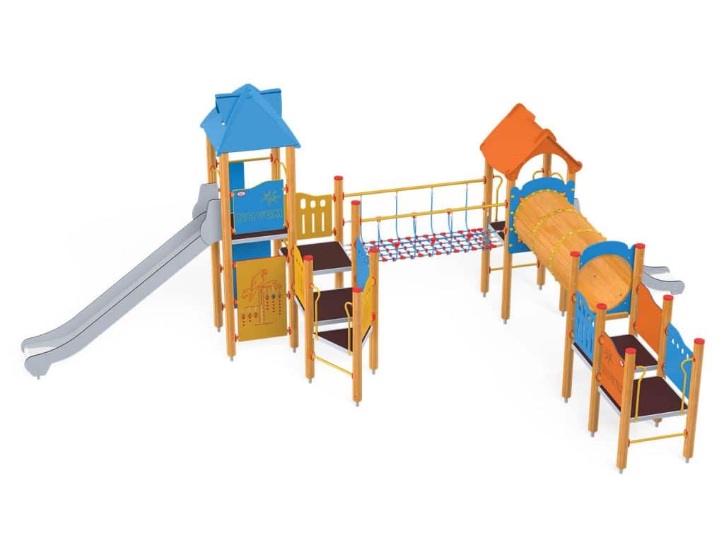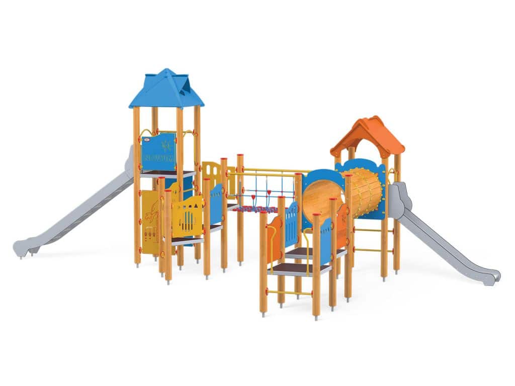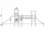 1 Turm mit Dach, 1 Turm mit Satteldach, 1 Dreiecksplattform, 4 quadratische Plattformen, 1 Rohrbrücke, 1 Tunnelbrücke, 1 Langrutsche, 1 Tiefrutsche, 2 Wände mit Zierschnitten, 10 Sicherheits-HDPE-Platten mit Zierschnitten, 2 quadratische Podeste, 4 Einstiege, 6 Kletterstangen, 2 Metallstangen über der Rutsche, 19 Metallbeschläge zum Einbau in den Boden