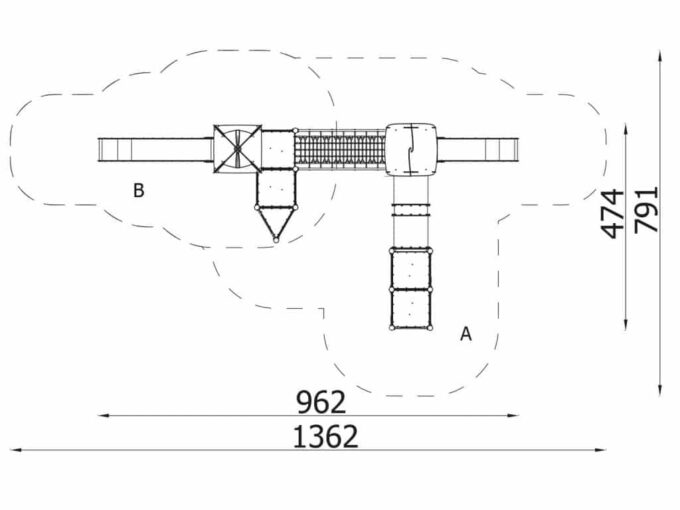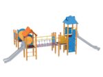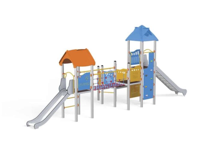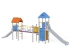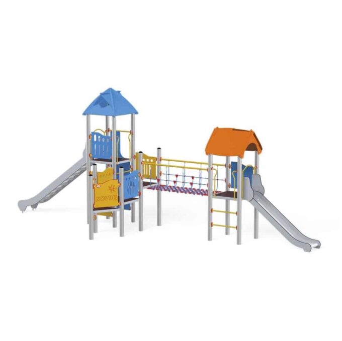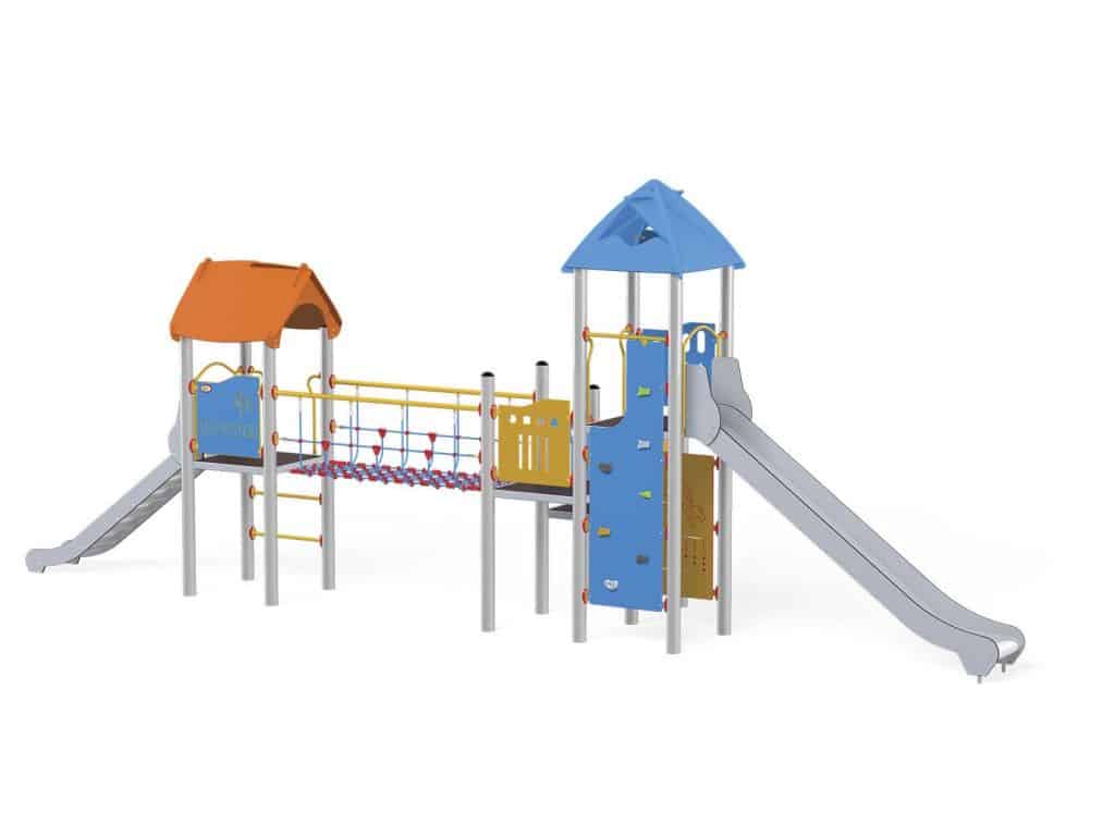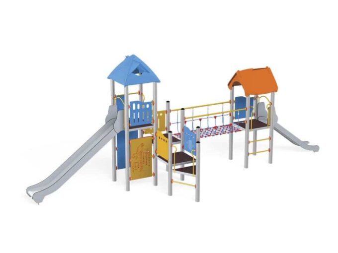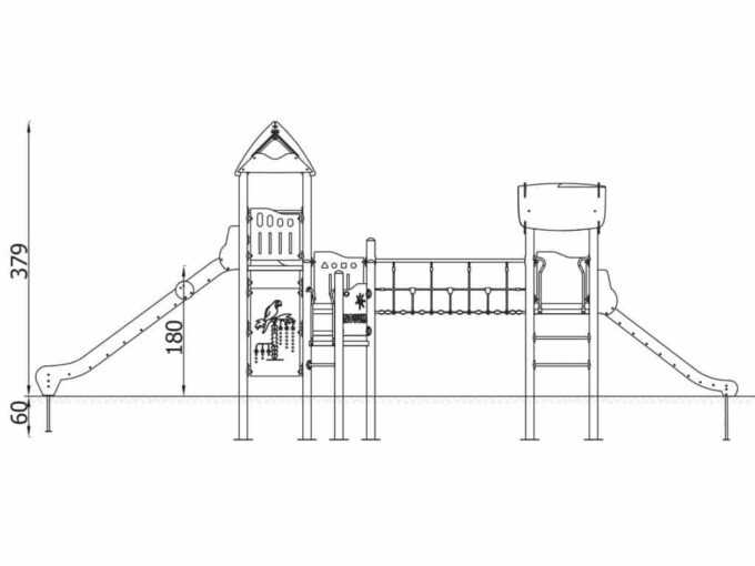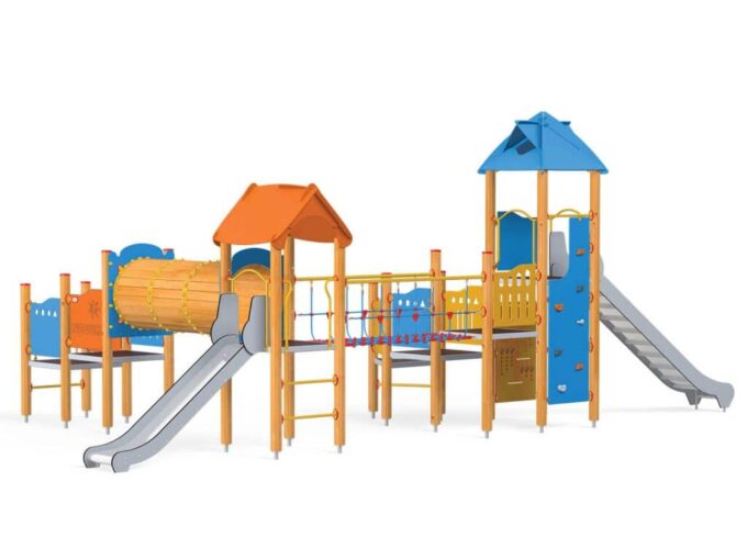 1 Turm mit Dach, 1 Turm mit Satteldach, 1 Dreiecksplattform, 4 quadratische Plattformen, 1 Rohrbrücke, 1 Tunnelbrücke, 1 Langrutsche, 1 Tiefrutsche, 2 Wände mit Zierschnitten, 10 Sicherheits-HDPE-Platten mit Zierschnitten, 2 quadratische Podeste, 4 Einstiege, 6 Kletterstangen, 2 Metallstangen über der Rutsche, 19 Metallbeschläge zum Einbau in den Boden