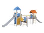 - Material: Die Tragpfosten bestehen aus runden Stahlrohren mit einem Durchmesser von 114 cm, die direkt im Boden befestigt werden. Rutschfeste Plattformen. Dächer, Sicherheitselemente und Paneele werden aus HDPE-Platten (High Durable Polyethylen) mit Musterzuschnitten hergestellt. Gleitfläche aus säurebeständigem Edelstahlblech. Seile aus Polypropylen mit Stahlkern, Stärke 16-18 mm, vandalismus- und UV-beständig. Alle Fittings und Anschlüsse sind witterungs- und UV-beständig. Stahlelemente sind durch Zinkschicht und Pulverlackierung gegen Korrosion geschützt.