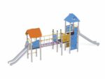 Turm 19 Artikelnr. 1146EPO Spielanlage bestehend aus zwei Türmen, einem mit Satteldach und dem anderen mit Walmdach, einer Rohrausführung, einer Tunnelbrücke, zwei Rutschbahnen, einem Sprossenaufstieg, einem dreieckigem Podest, 4 quadratischen Podesten, 4 Einstiegen. Diese Spielanlage ist auch als Ausführung mit feuerverzinkten Pfosten erhältlich.