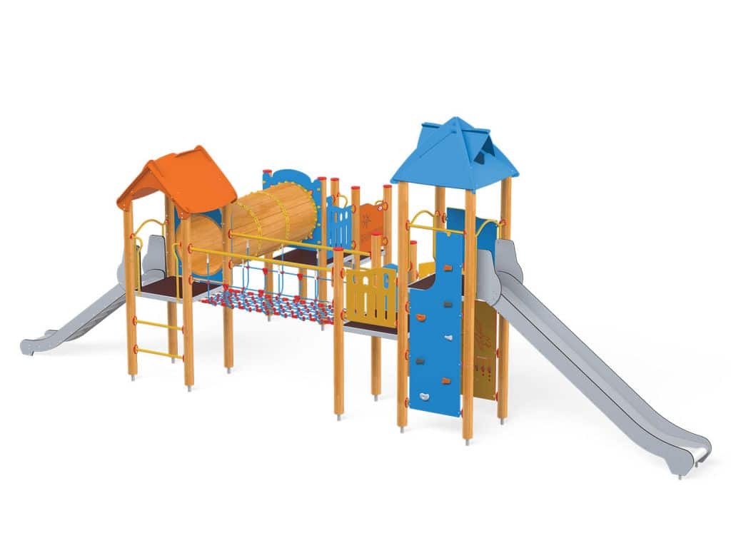 - Material: Imprägniertes, verleimtes Holz mit Längsfräsungen. Paneele aus HDPE. Verzinkte und pulverbeschichtete Metallelemente. Rutschbahn aus Edelstahl.