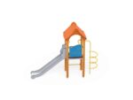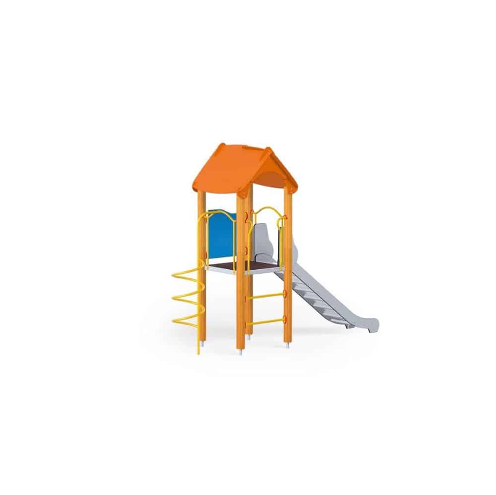 - Material Variante Holz: Imprägniertes, verleimtes Holz mit Längsfräsungen. Paneele aus HDPE. Verzinkte und pulverbeschichtete Metallelemente. Rutschbahn aus Edelstahl.