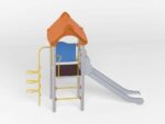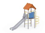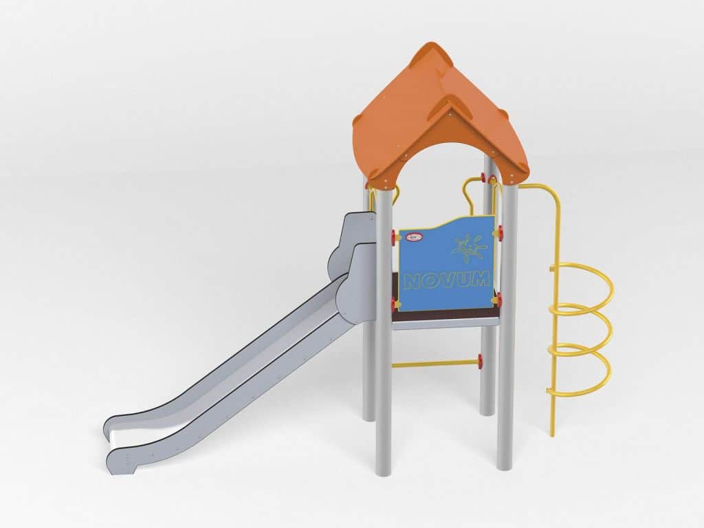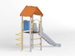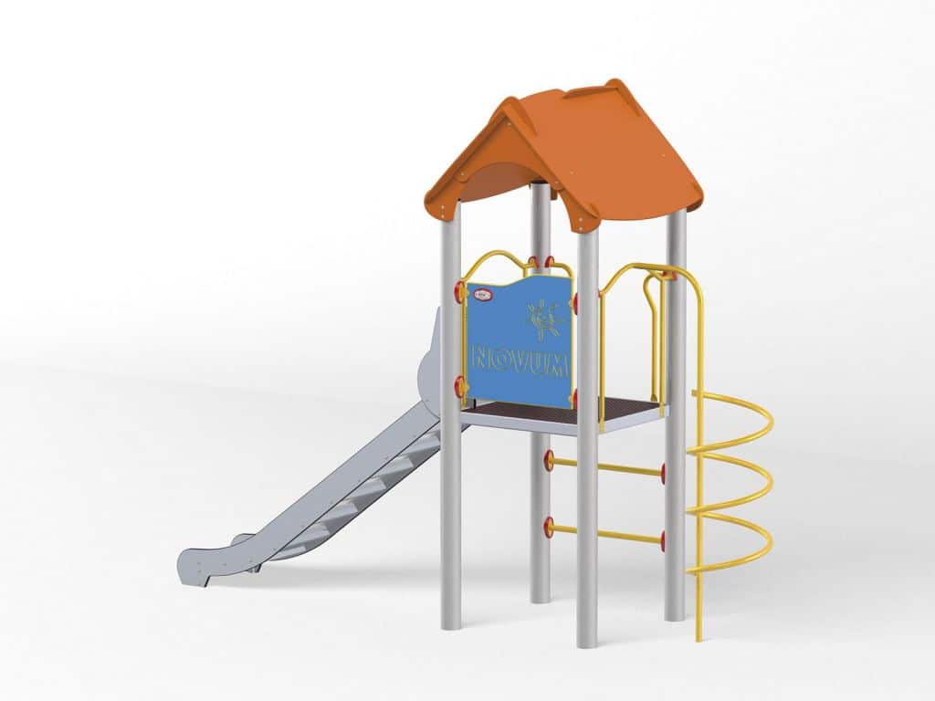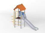 - Material Variante Metall: Die Tragpfosten bestehen aus runden Stahlrohren mit einem Durchmesser von 114 cm, die direkt im Boden befestigt werden. Rutschfeste Plattformen. Dächer, Sicherheitselemente und Paneele werden aus HDPE-Platten (High Durable Polyethylen) mit Musterzuschnitten hergestellt. Gleitfläche aus säurebeständigem Edelstahlblech. Seile aus Polypropylen mit Stahlkern, Stärke 16-18 mm, vandalismus- und UV-beständig. Alle Fittings und Anschlüsse sind witterungs- und UV-beständig. Stahlelemente sind durch Zinkschicht und Pulverlackierung gegen Korrosion geschützt.