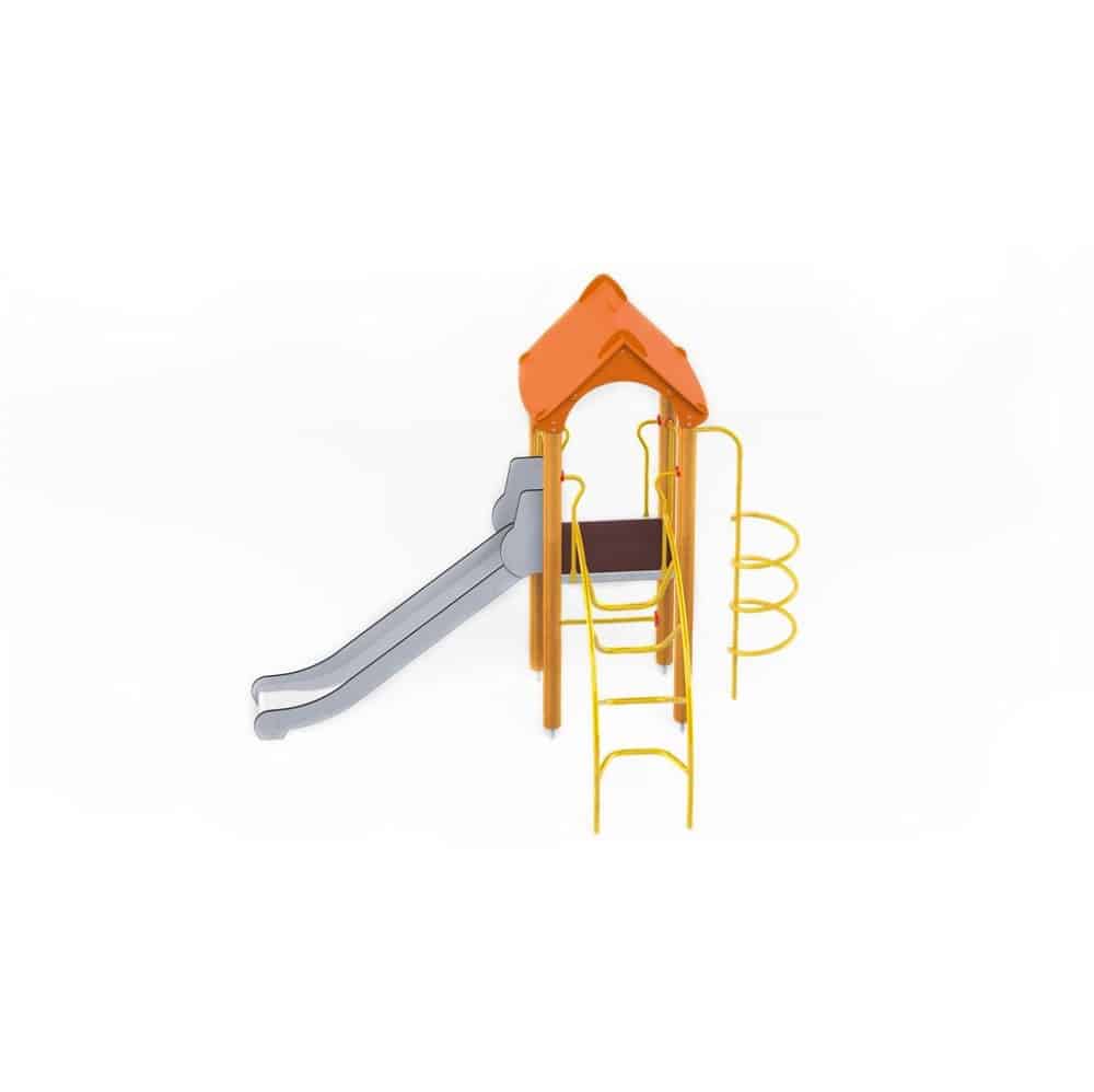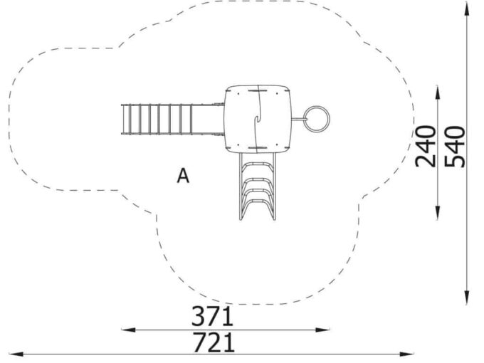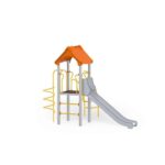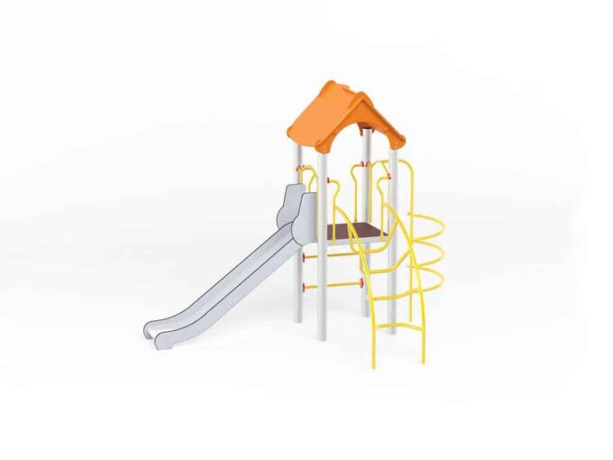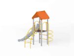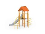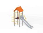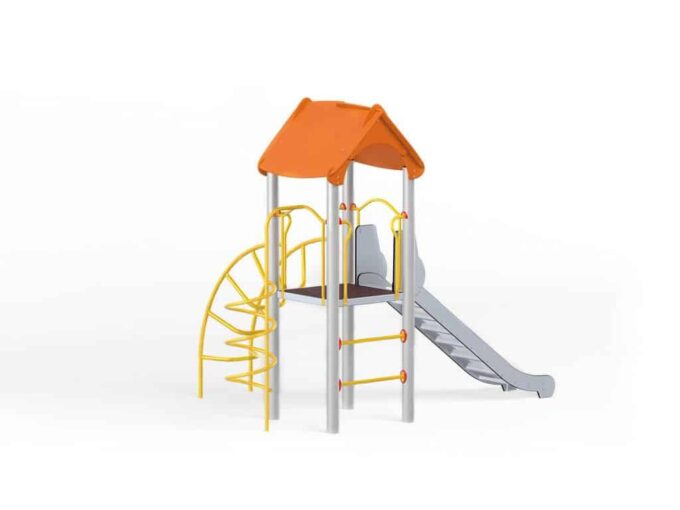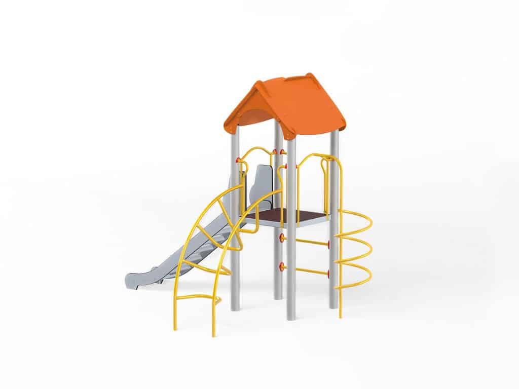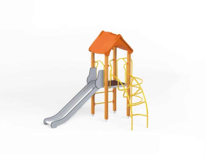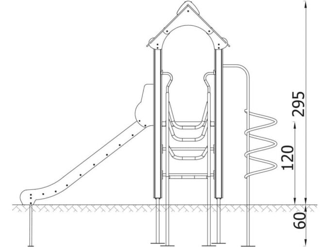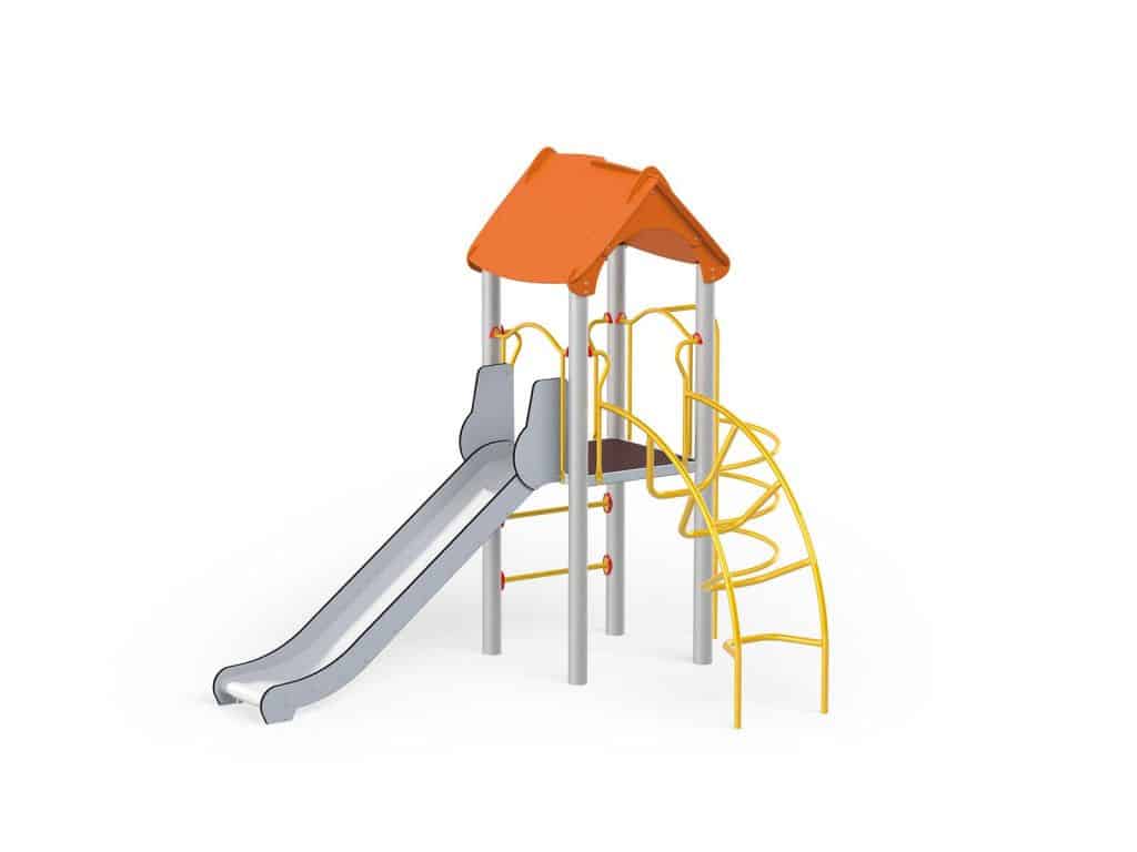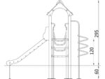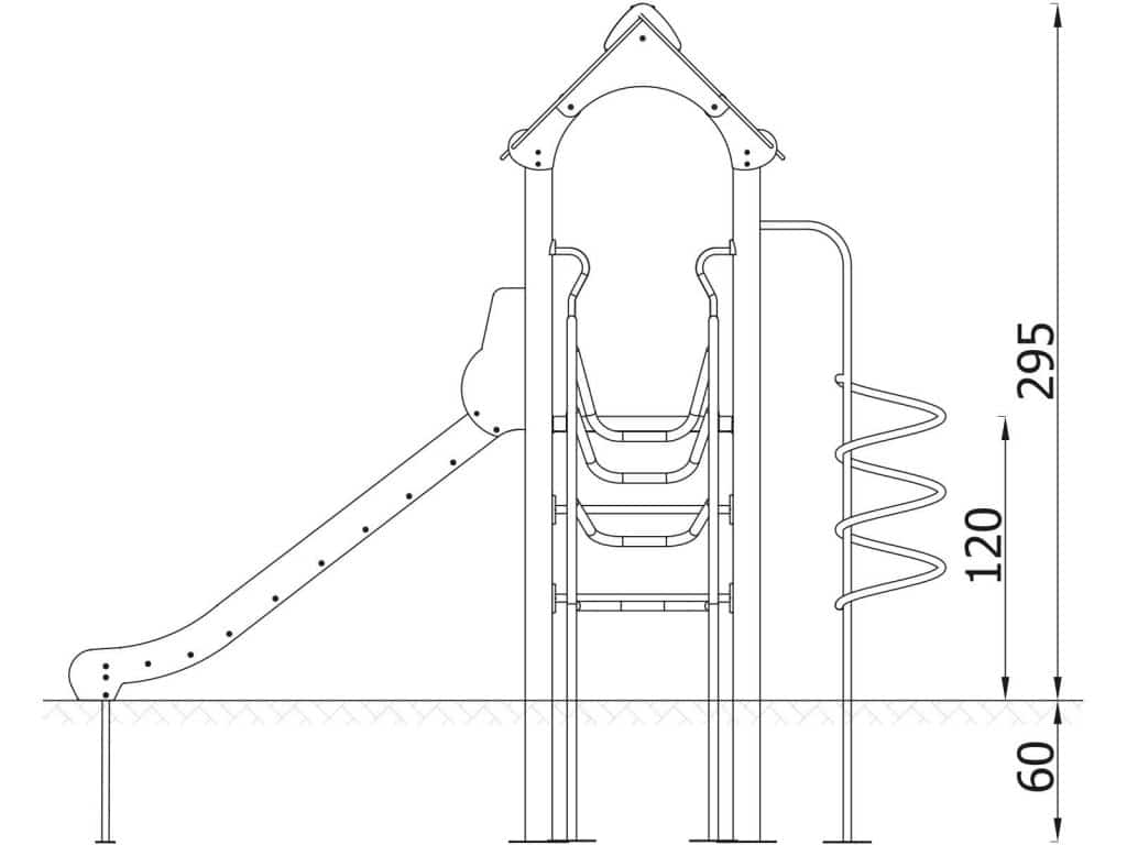 - Material Variante Metall: Die Tragpfosten bestehen aus runden Stahlrohren mit einem Durchmesser von 114 cm, die direkt im Boden befestigt werden. Rutschfeste Plattformen. Dächer, Sicherheitselemente und Paneele werden aus HDPE-Platten (High Durable Polyethylen) mit Musterzuschnitten hergestellt. Gleitfläche aus säurebeständigem Edelstahlblech. Seile aus Polypropylen mit Stahlkern, Stärke 16-18 mm, vandalismus- und UV-beständig. Alle Fittings und Anschlüsse sind witterungs- und UV-beständig. Stahlelemente sind durch Zinkschicht und Pulverlackierung gegen Korrosion geschützt.