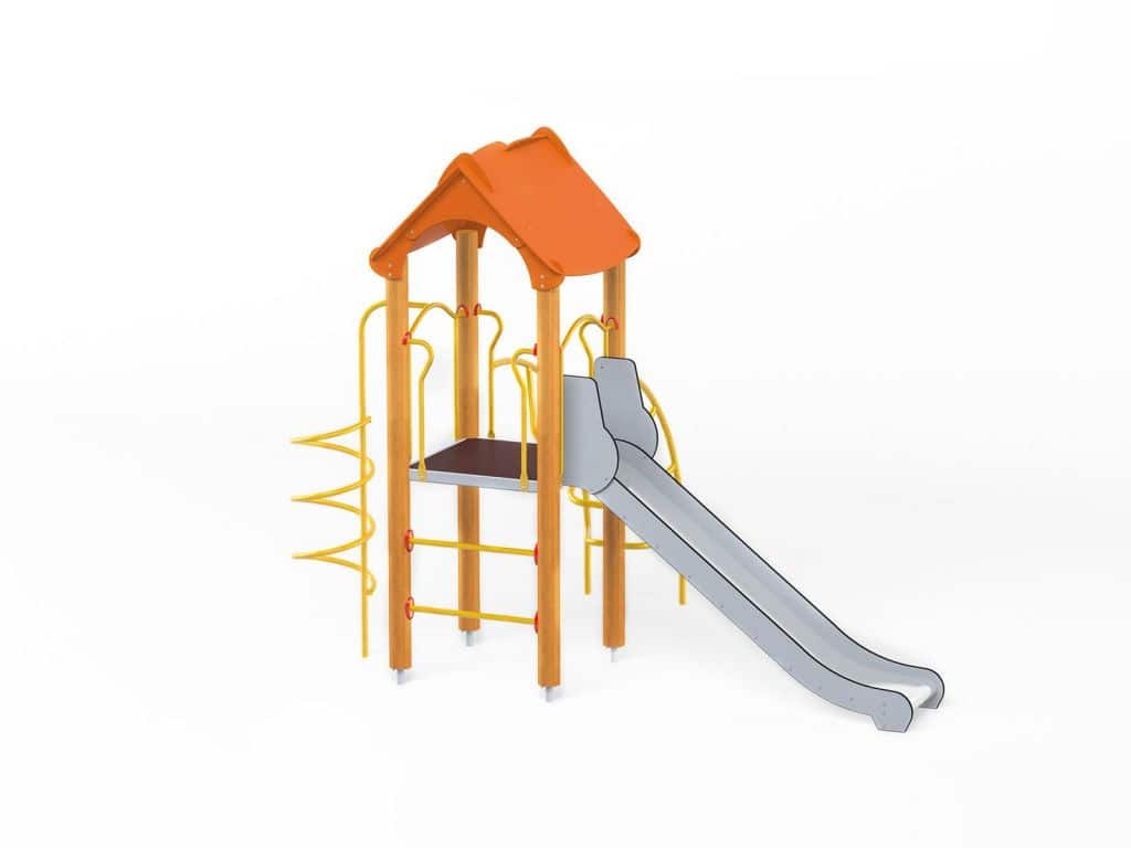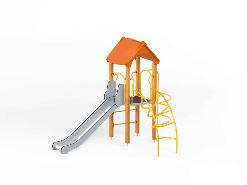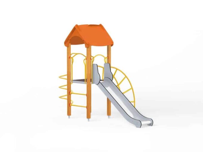 - Material Variante Holz: Imprägniertes, verleimtes Holz mit Längsfräsungen. Paneele aus HDPE. Verzinkte und pulverbeschichtete Metallelemente. Rutschbahn aus Edelstahl.