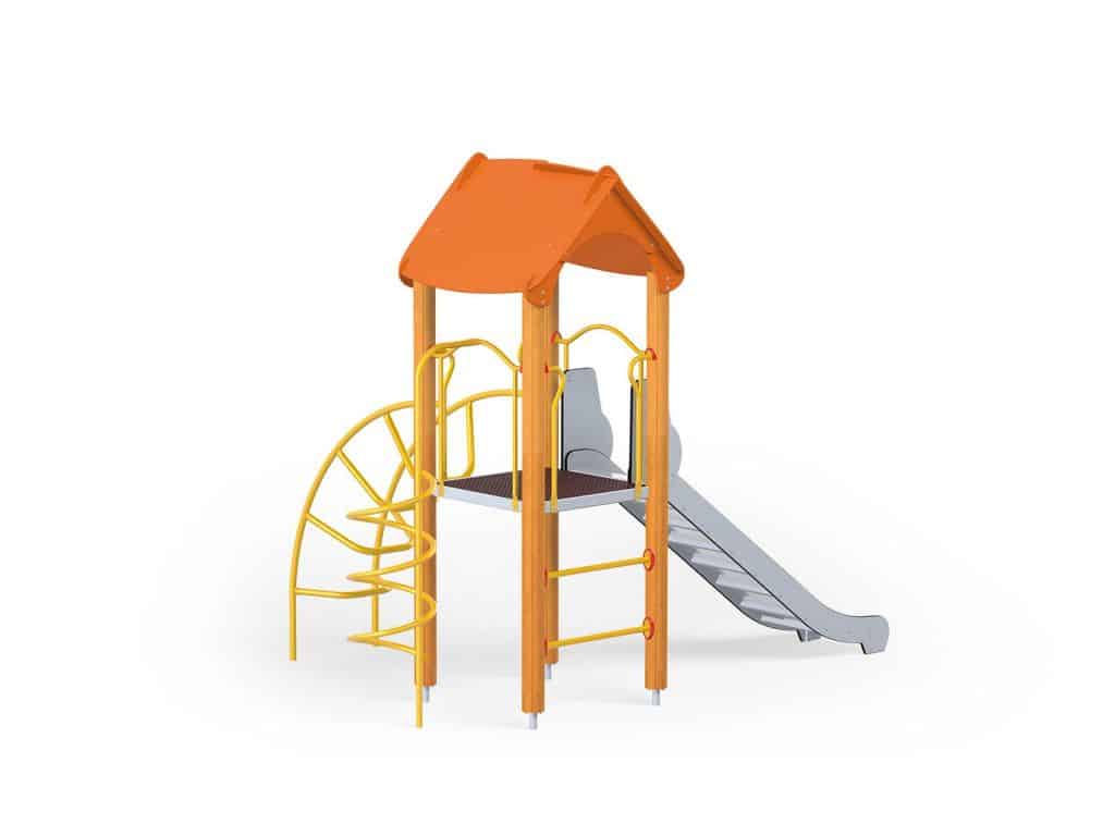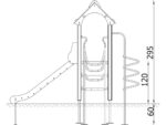 Turm 7 Artikelnr. 1134 Spielturm mit einem Satteldach, einer Rutsche, einem Bogenaufstieg, einem Spiralaufstieg, einem Einstieg. Diese Spielanlage ist auch mit feuerverzinkten Pfosten erhältlich.