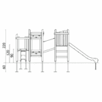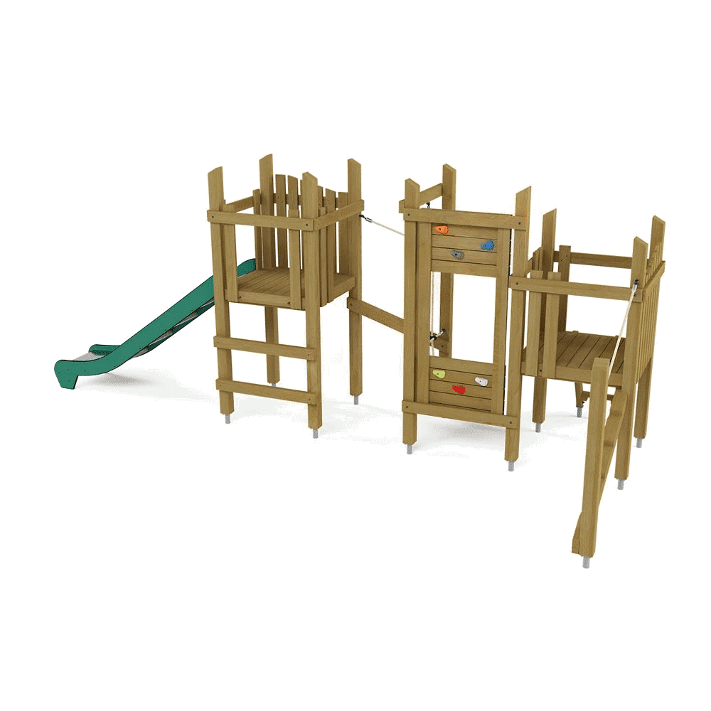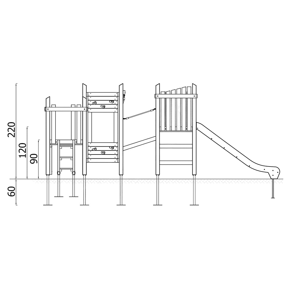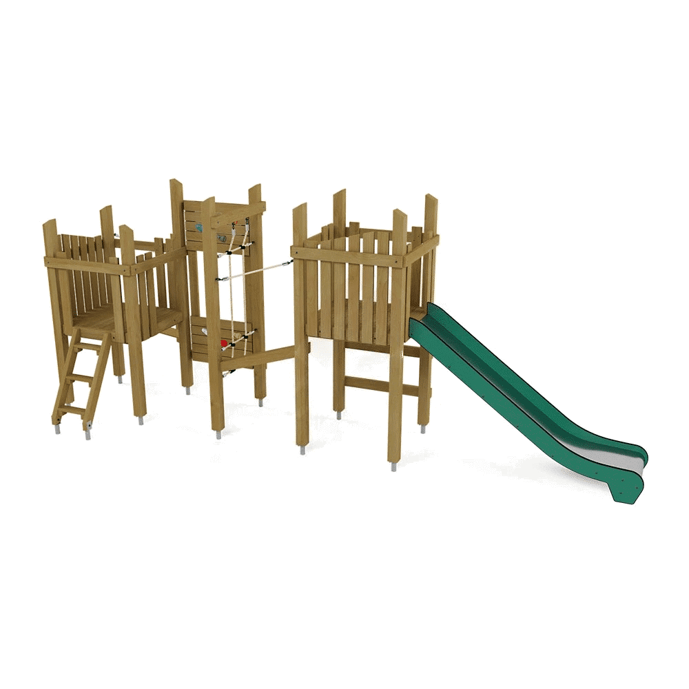 Das Retro Set 202 bietet zahlreiche Herausforderungen zum Klettern, Balancieren und Rutschen. Die Kinder können sich auf zwei Podeste wagen, die durch einen Parcours aus Kletterwand, Kletternetz und schrägem Balancierbalken mit Seil verbunden sind. Von den Podesten aus geht es über eine lange Rutsche wieder hinab – ein Highlight für jedes Kind!