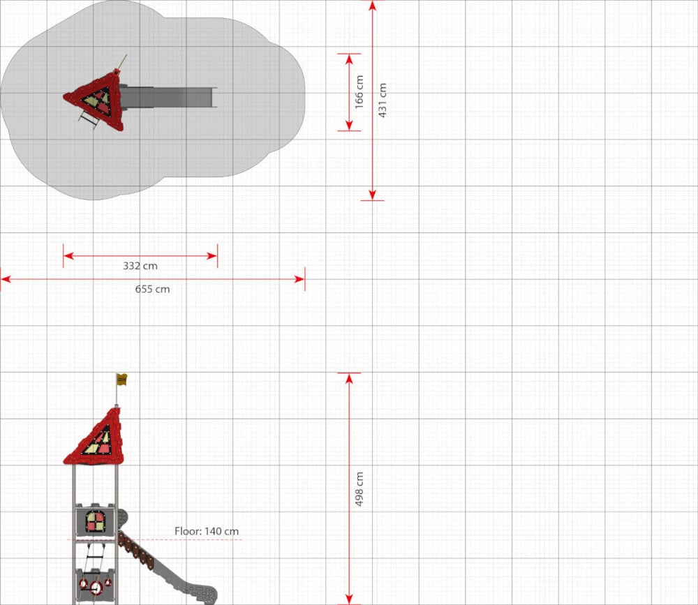 Der Turm fordert und fördert die Motorik von Kindern im Alter von 3 bis 4 Jahren. Eine Strickleiter führt zu einer dreieckigen rutschfesten Plattform, deren Bodenhöhe 140 cm beträgt. Von hier aus kann man die Rutsche hinabsausen, was für Spannung sorgt und Kindern den Zusammenhang zwischen Ursache und Wirkung verdeutlicht. Zudem können sie vor den Fenstern mit den bunten Scheiben stehen und die Action am Boden wie durch eine rot-gelbe Brille beobachten.