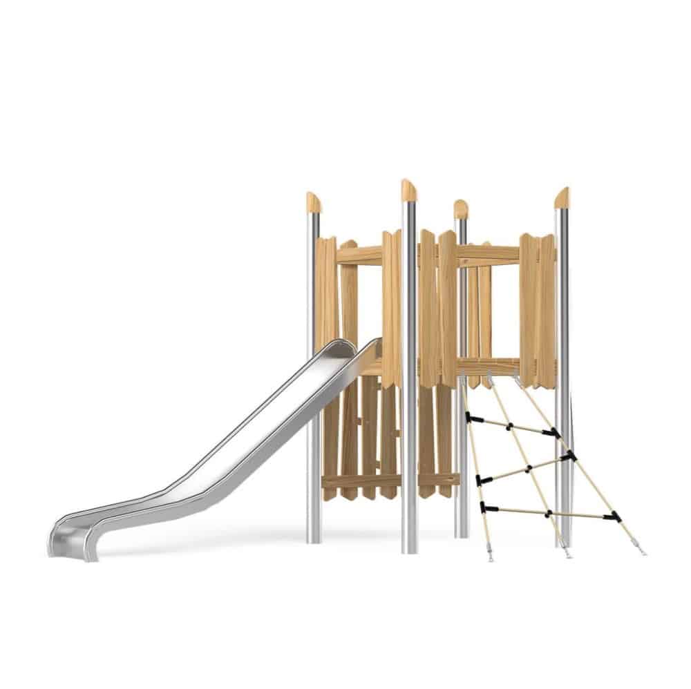 Der Spielturm Robinio 18102 besteht aus einem Spielturm ohne Dach, einer Rutsche, einer Rutschstange, einem Kletternetz und einer Kletterwand. Das naturbelassene Set macht jeden Kindergarten- oder Vorschulspielplatz attraktiver. Der Spielturm ist aus hochwertigem Metall und Robinien-Holz gefertigt.