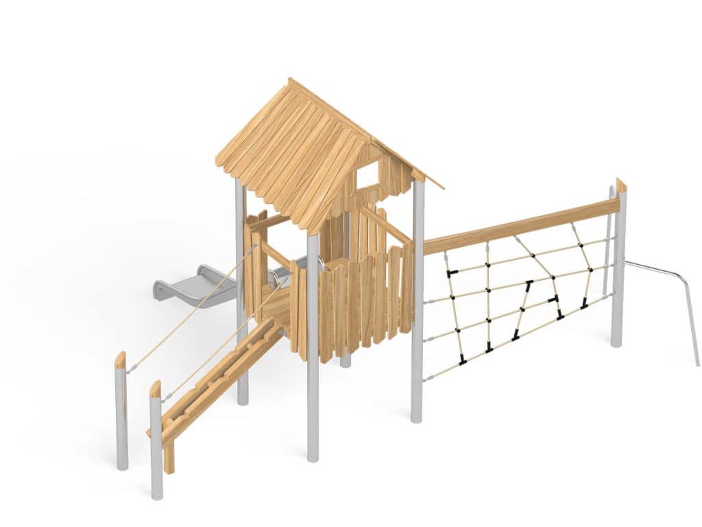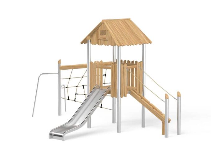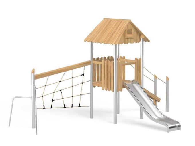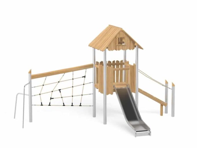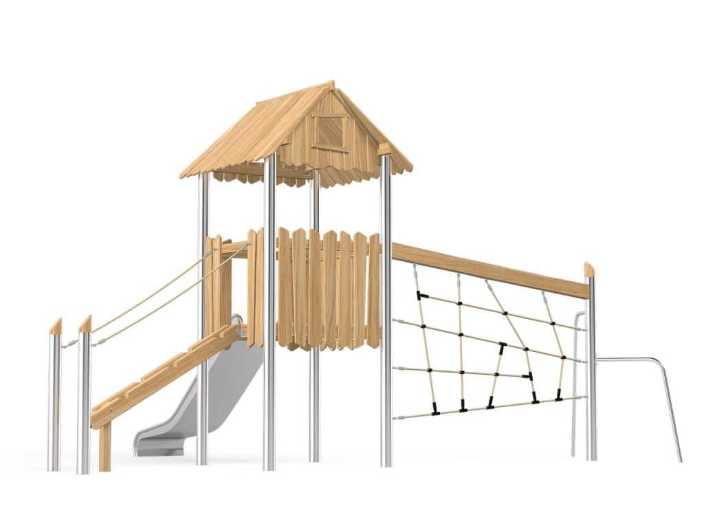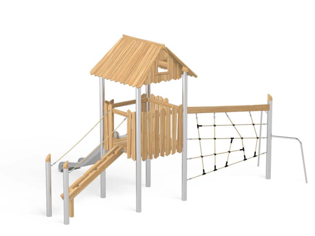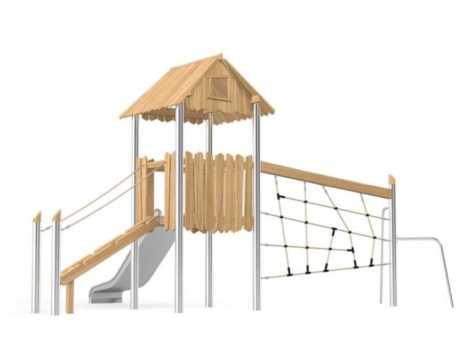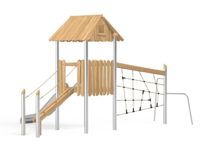 Der Spielturm Robinio 18105 besteht aus einem Spielturm mit Dach, einer Rutsche, einem Balancierbalken und einem Kletternetzen. Das naturbelassene Set macht jeden Kindergarten- oder Vorschulspielplatz attraktiver. Der Spielturm ist aus hochwertigem Metall und Robinien-Holz gefertigt.