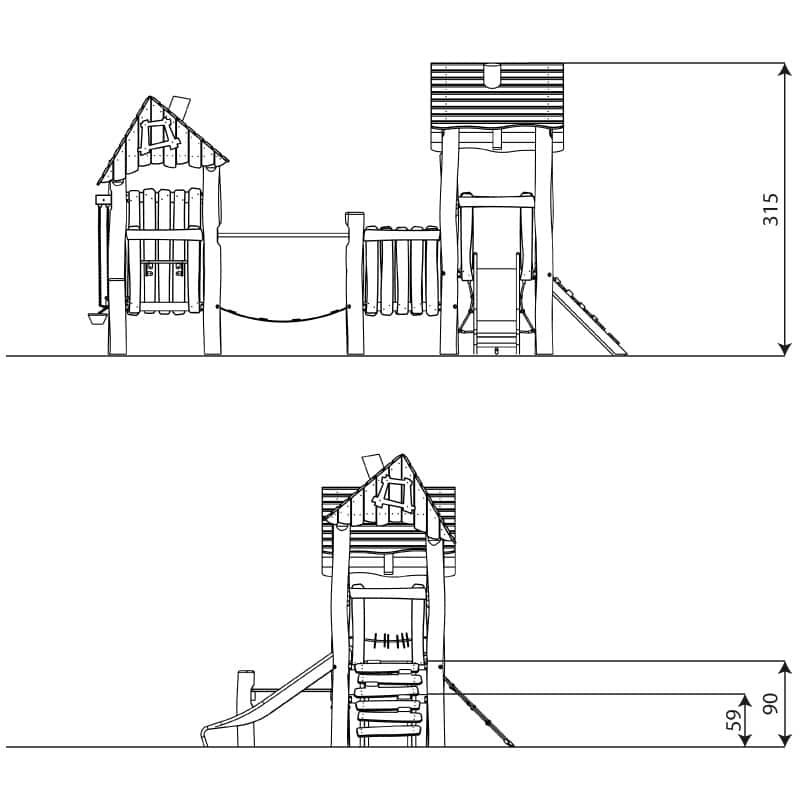 - Sicherheit geht vor: Die Spielturmanlage erfüllt die strengen Sicherheitsstandards gemäß der Norm EN 1176-1:2017+A1:2023. Kalibrierte Ketten aus rostfreiem Stahl und robuste Beschläge sorgen dafür, dass die Kinder sicher schaukeln und spielen können, während spezialisierte Details wie die Bewegliche Elemente und Brücken sicherstellen, dass Spaß und Sicherheit Hand in Hand gehen.