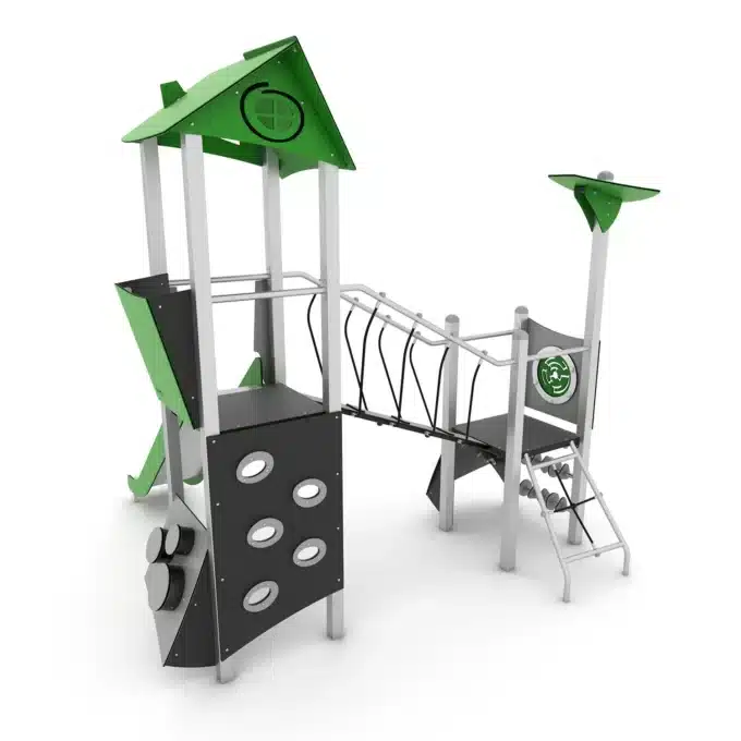 - Vielfältige Spielmöglichkeiten: Der STEEL+ 1707 bietet eine spannende Kombination aus Rutschen, einer Brücke und herausfordernden Kletterelementen. Kinder können über die Brücke balancieren, die Rutsche hinuntergleiten oder die Kletterwände erobern. Diese Aktivitäten fördern nicht nur die körperliche Entwicklung, sondern auch die sozialen Fähigkeiten, da Kinder zusammen spielen und lernen.