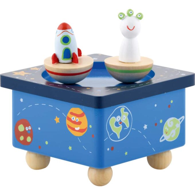 Unsere Spieluhr Weltall ist aus hochwertigem Holz gefertigt und hat kompakte Maße von 10 x 10 x 7 cm. Die liebevoll gestalteten Figuren – eine Rakete und ein Außerirdischer, jeweils 5 cm hoch – bewegen sich zur musikalischen Untermalung und sorgen für eine beruhigende Atmosphäre, die Kinder sanft in den Schlaf wiegt.