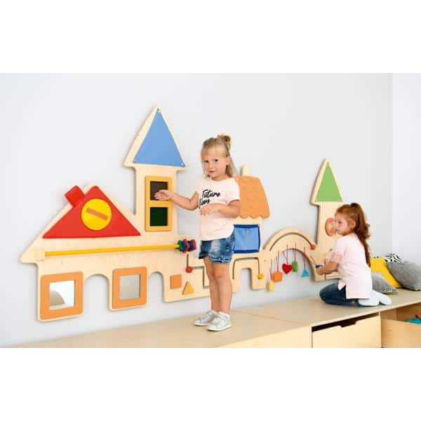 Unsere Spielwand – Stadt ist eine wunderbare Ergänzung für Kindergärten, die Kinder in eine faszinierende Miniaturwelt entführt. Diese Spielwand bietet zahlreiche Möglichkeiten zur Schulung des Tastsinns, der motorischen Fähigkeiten und der Auge-Hand-Koordination. Formen und Farben werden spielerisch erkundet, während bewegliche Elemente Klänge erzeugen und Fenster mit Vorhängen und Reißverschlüssen für zusätzliche Interaktivität sorgen.