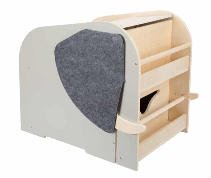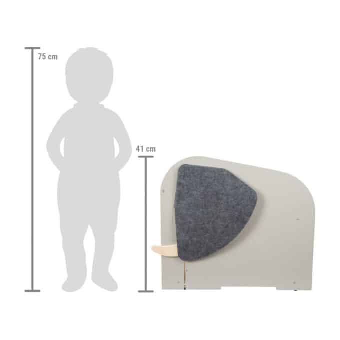 - Fördert Kreativität und Feinmotorik: Die Front des Elefanten ist ein wahres Kreativzentrum. Eine herausnehmbare Stange zwischen den Stoßzähnen kann eine Papierrolle aufnehmen und verwandelt die Box in einen mobilen Maltisch. In den Fächern darüber finden Bücher und Stifte ihren Platz. Die geheimen Öffnungen hinter den weichen Filzohren und der drehbare Schwanz als Schließmechanismus fördern zudem die Neugier und schulen die Feinmotorik.