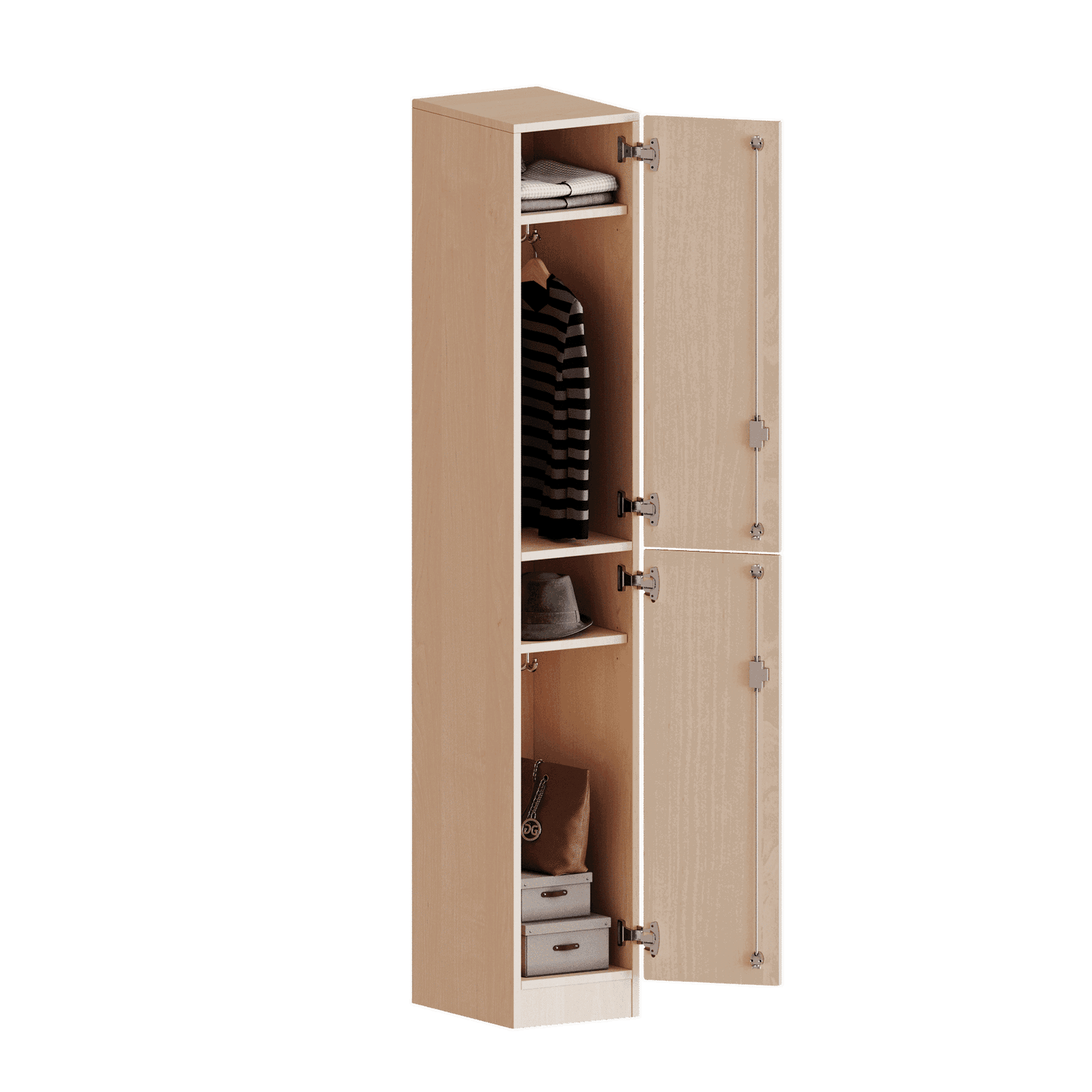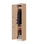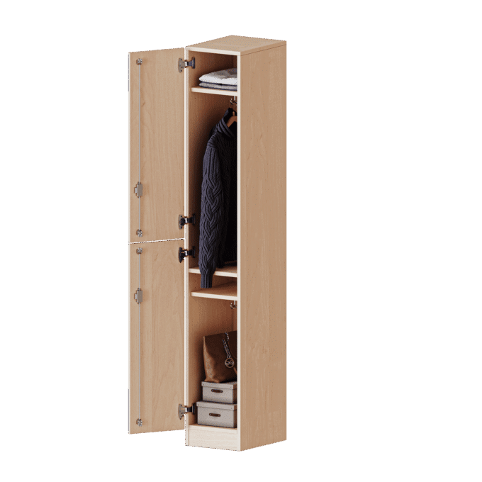Die evo180 Spinde, die in verschiedenen Modellen erhältlich sind, sind ein wesentlicher Bestandteil der evo180 Schrankwandauswahl. Die Rückwand ist so gestaltet, dass sie sichtbar ist, so dass alle Einzelspinde oder Spindwände auch als Raumteiler dienen können. Im Inneren jedes Spinds befinden sich eine Ablage für Hüte und Mützen sowie dreifache Haken, so dass sie sich in Kombination mit anderen Spinden ideal als Garderobenschränke für mehrere Nutzer eignen. Außerdem hat jede Tür eine 270°-Öffnung und zwei übereinander gestapelte Fächer. Alle Schränke bestehen aus melaminbeschichteten E1-Feinspanplatten, die FSC-zertifiziert und frei von Formaldehyd sind. Sie sind zusätzlich mit 2 mm dicken ABS-Kanten verstärkt, die unter hohen Temperaturen verleimt wurden.