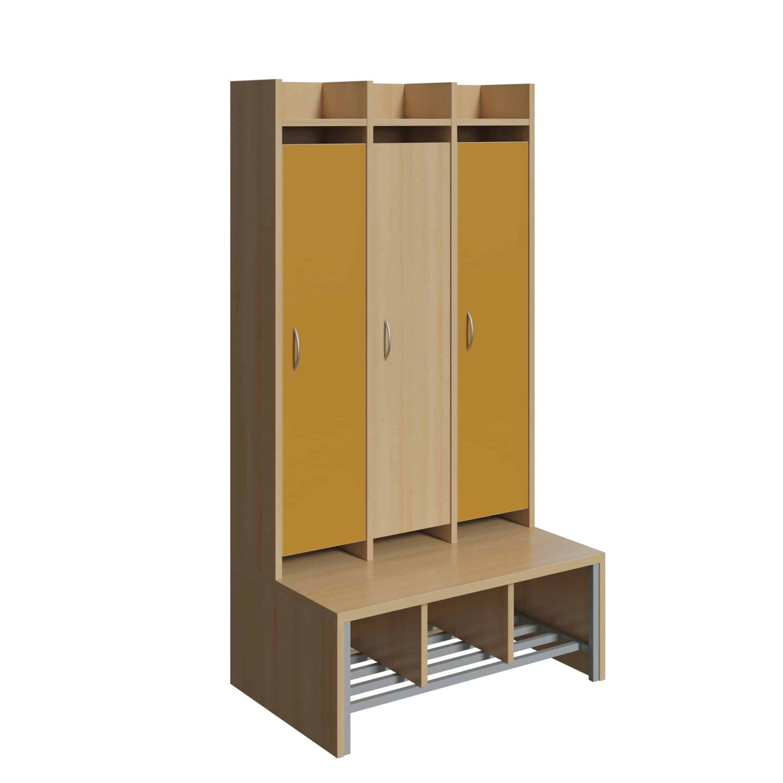 Unsere Spindgarderobe mit großer Tür bietet jedem Kind viel Platz. Durch das Stahlgestell, sowie die 25mm dicke, melaminharzbeschichtete Spanplatte der Garderobenbank, ist die Garderobe zudem sehr stabil. Auf dem Schuhrost aus 9006 Weißaluminium können die Schuhe der Kinder sorgfältig angeordnet werden, wodurch keine Kinderschuhe auf dem Boden des Ankleidebereichs verteilt liegen. Die Türen der Garderobe verfügen über Lüftungsschlitze oben und unten, wodurch eine Luftzirkulaton innerhalb gewährleistet ist. Die Türen können für einen Aufpreis je Tür wahlweise auch als abschließbare Türen bestellt werden.
