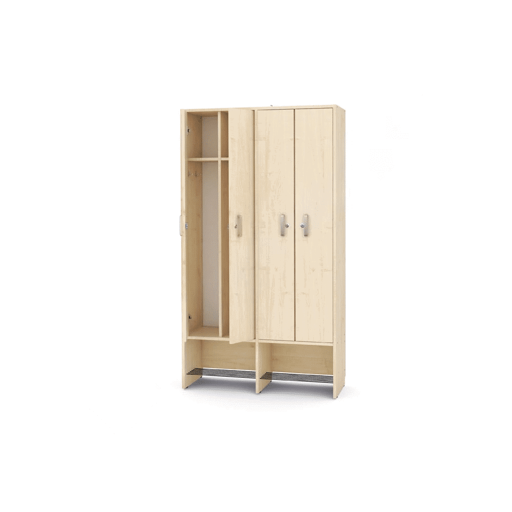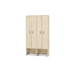 Unser Spindschrank bietet 4 abschließbare Fächer, die sich perfekt für die Aufbewahrung von Jacken, Taschen und anderen persönlichen Gegenständen eignen. Jedes Fach ist mit einem Doppelhaken versehen, sodass Sie Ihre Kleidung ordentlich aufhängen können. Außerdem gibt es eine praktische Mützenablage, die dafür sorgt, dass auch Kopfbedeckungen immer ihren Platz haben.