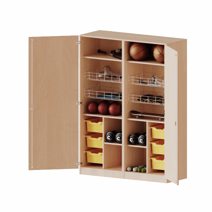 - Maximal flexibler Stauraum: Zusätzlich zu den Spezialfächern verfügt dieser Schrank über vier verstellbare Einlegeböden. Diese schaffen wertvollen, anpassbaren Platz für sperrigere Gegenstände, Ordner mit Trainingsplänen, Erste-Hilfe-Koffer oder große Spielesets.