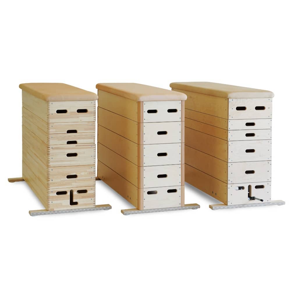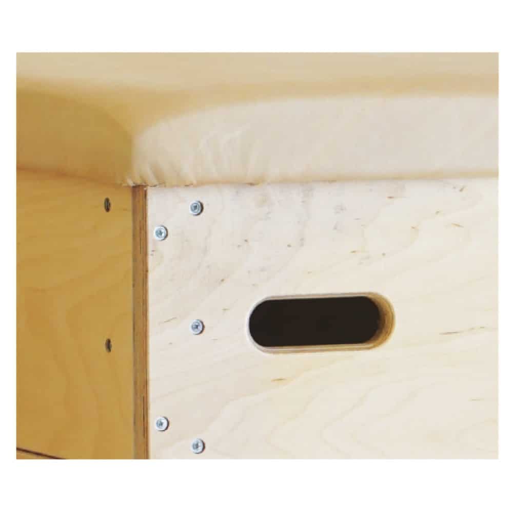 Die Sprungkästen bestehen aus Kiefer oder aus Birke Multiplex, ihre Oberfläche ist fein geschliffen und mit umweltfreundlichem Wasserlack lackiert. Optimale Standfestigkeit garantieren die Multiplex Standfüße mit nichtfärbenden Gummipuffern. Die Sprungkästen sind gepolstert und wahlweise mit Kernrindleder oder Kunstleder lieferbar. Aussparungen im Kastendeckel sind zum Einhängen von Turnbänken vorgesehen (bitte separat bestellen).