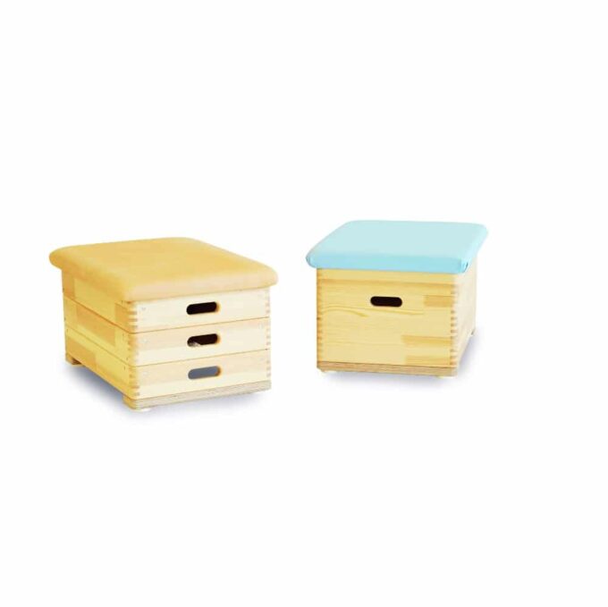 Die Sprungkästen bestehen aus Kiefer oder aus Birke Multiplex, ihre Oberfläche ist fein geschliffen und mit umweltfreundlichem Wasserlack lackiert. Optimale Standfestigkeit garantieren die Multiplex Standfüße mit nichtfärbenden Gummipuffern. Die Sprungkästen sind gepolstert und wahlweise mit Kernrindleder oder Kunstleder lieferbar.