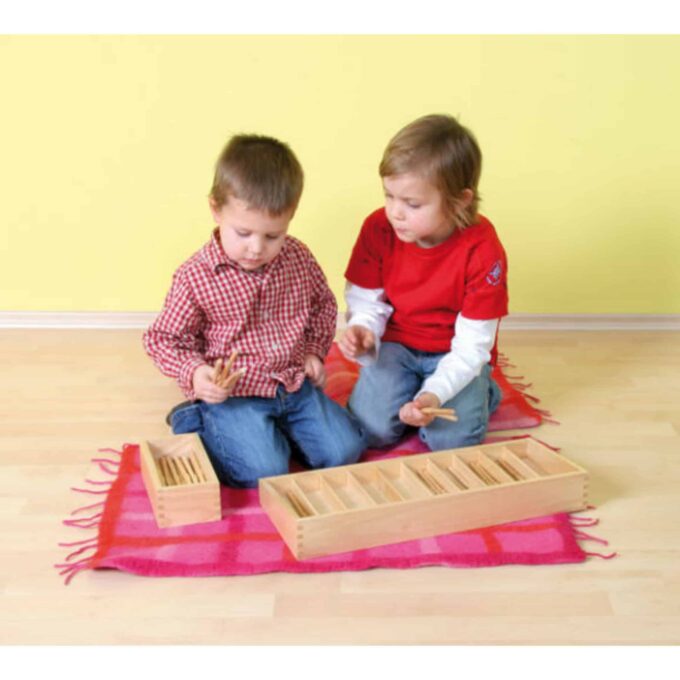 Die Stäbchen sind mit einem mittleren Griffbereich versehen, sodass die Kinder sie problemlos greifen und spielerisch verwenden können. Sie lassen sich gut in verschiedenen Lernspielen oder als kreatives Material zum Basteln und Gestalten einsetzen. Darüber hinaus ist die edle Holzbox nicht nur praktisch für die Aufbewahrung der Stäbchen, sondern lädt auch zum Gestalten und Bemalen ein – der Kreativität sind keine Grenzen gesetzt!