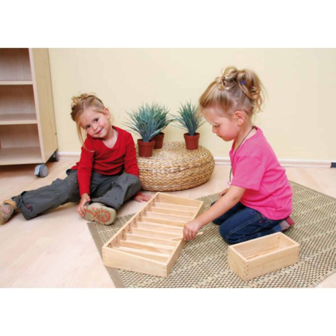 In der Betzold Stäbchen-Box dreht sich alles um den praktischen Zugang zur Mathematik. Die Anzahl der Stäbchen in jedem Bereich entspricht den angezeigten Zahlen: Das Kästchen für 0 bleibt leer, in das für 1 kommt ein Stab und in das für 2 zwei Stäbchen. So wird den Kindern schnell bewusst, dass Zahlen nicht nur abstrakte Symbole sind, sondern konkrete Werte repräsentieren, die aus mehreren Elementen bestehen.