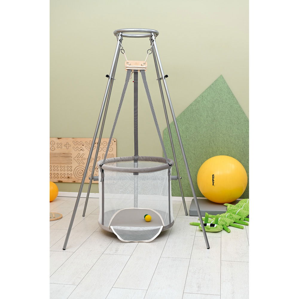 Die Höhe und Breite des Gestells sind exakt auf den Memola-Korb zugeschnitten, sodass dieser frei schwingen und seine sensorische Wirkung voll entfalten kann.