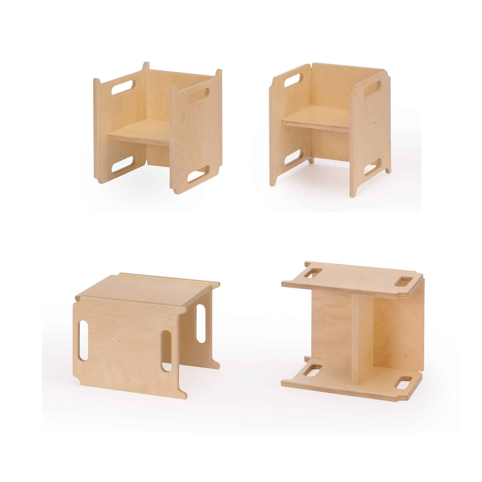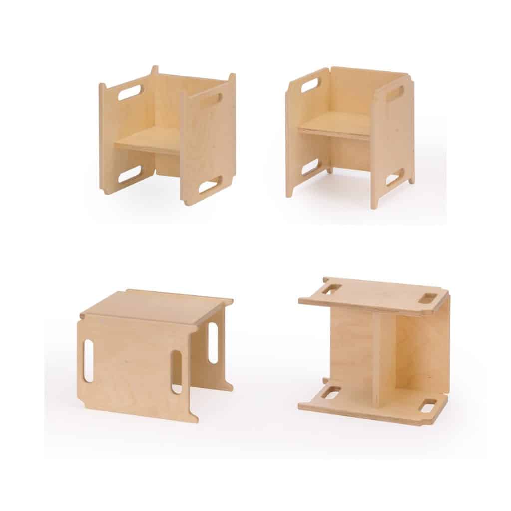 Stapel-Wendestuhl aus Holz. Jeder Stuhl hat 4 Sitzhöhen und ist stapelbar zum Regal und kann auch als Tisch verwendbar.