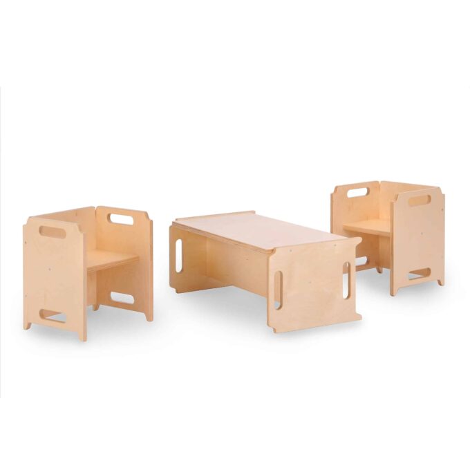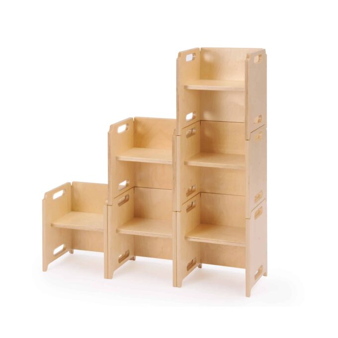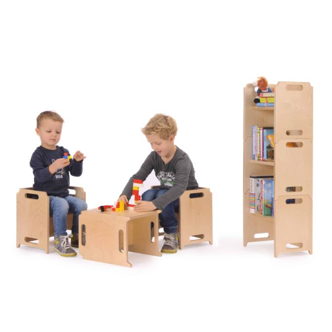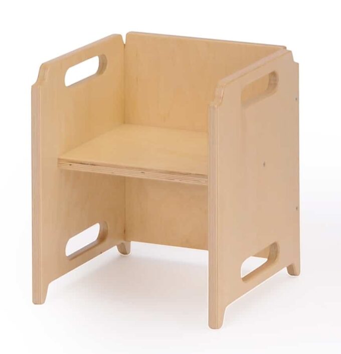 Stapel-Wendestuhl aus Holz. Jeder Stuhl hat 4 Sitzhöhen und ist stapelbar zum Regal und kann auch als Tisch verwendbar.