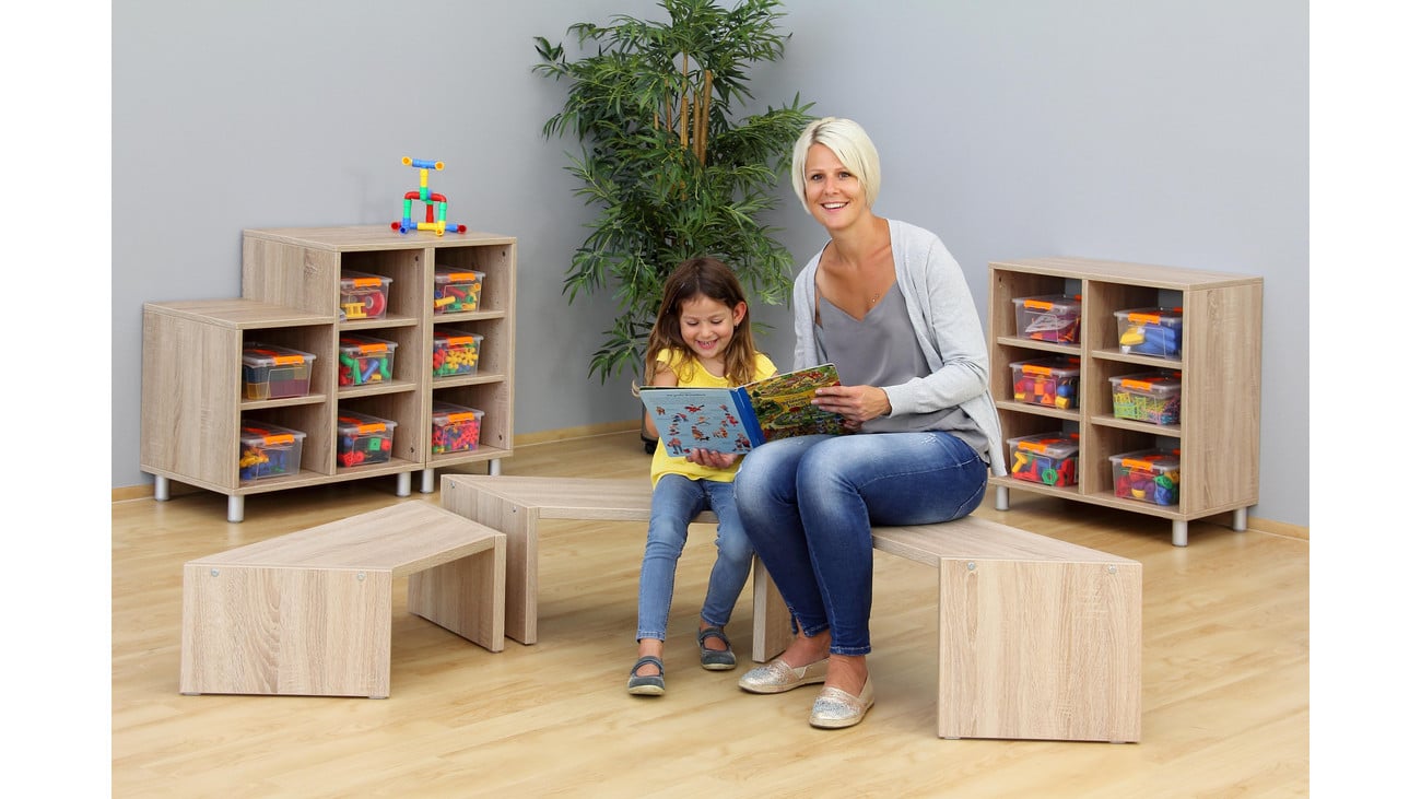 Mit den verschiedenen Höhen und Breiten bietet dieses Set zahlreiche Gestaltungsmöglichkeiten. Kinder können die Bänke einfach zusammensetzen, um eine bequeme Sitzgelegenheit für Gruppenaktivitäten zu schaffen. Die Trapezform der Bänke ermöglicht sogar das Bilden einer kreisförmigen Sitzgruppe – perfekt für gemeinsames Spielen oder kreative Projekte. Die Stabilität der Bänke wird durch besonders starke Verbindungen gewährleistet, sodass sie auch bei lebhaften Aktivitäten sicher stehen bleiben.