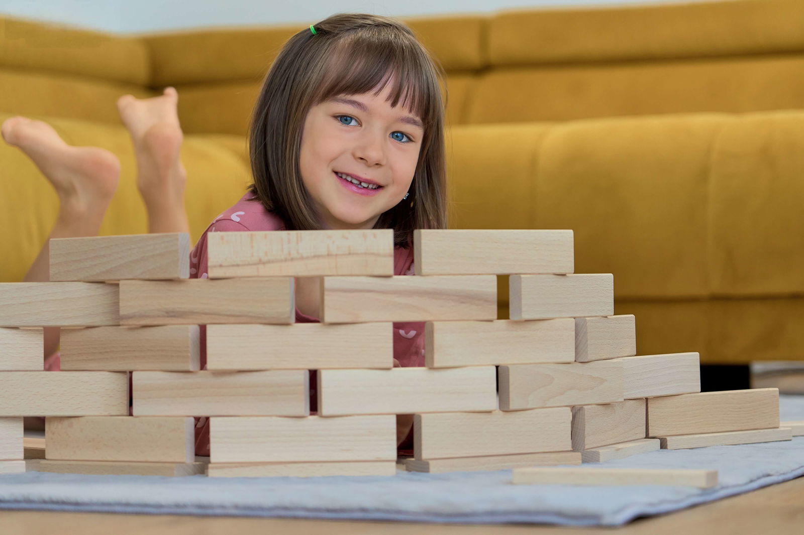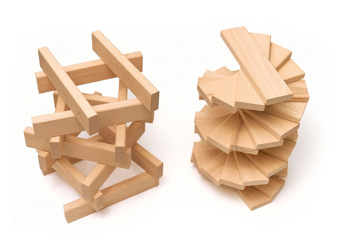 Die Leisten können auf unzählige Weisen kombiniert werden, sowohl flach als auch hochkant. Dadurch entstehen komplexe dreidimensionale Strukturen. Kinder müssen vorausdenken und planen, wie sie stabile Wände oder ausgefallene Muster errichten. Diese Herausforderung schult das räumliche Vorstellungsvermögen und regt die Kreativität an, weit über das Stapeln herkömmlicher Würfel hinaus. - Training für Feinmotorik und Konzentration