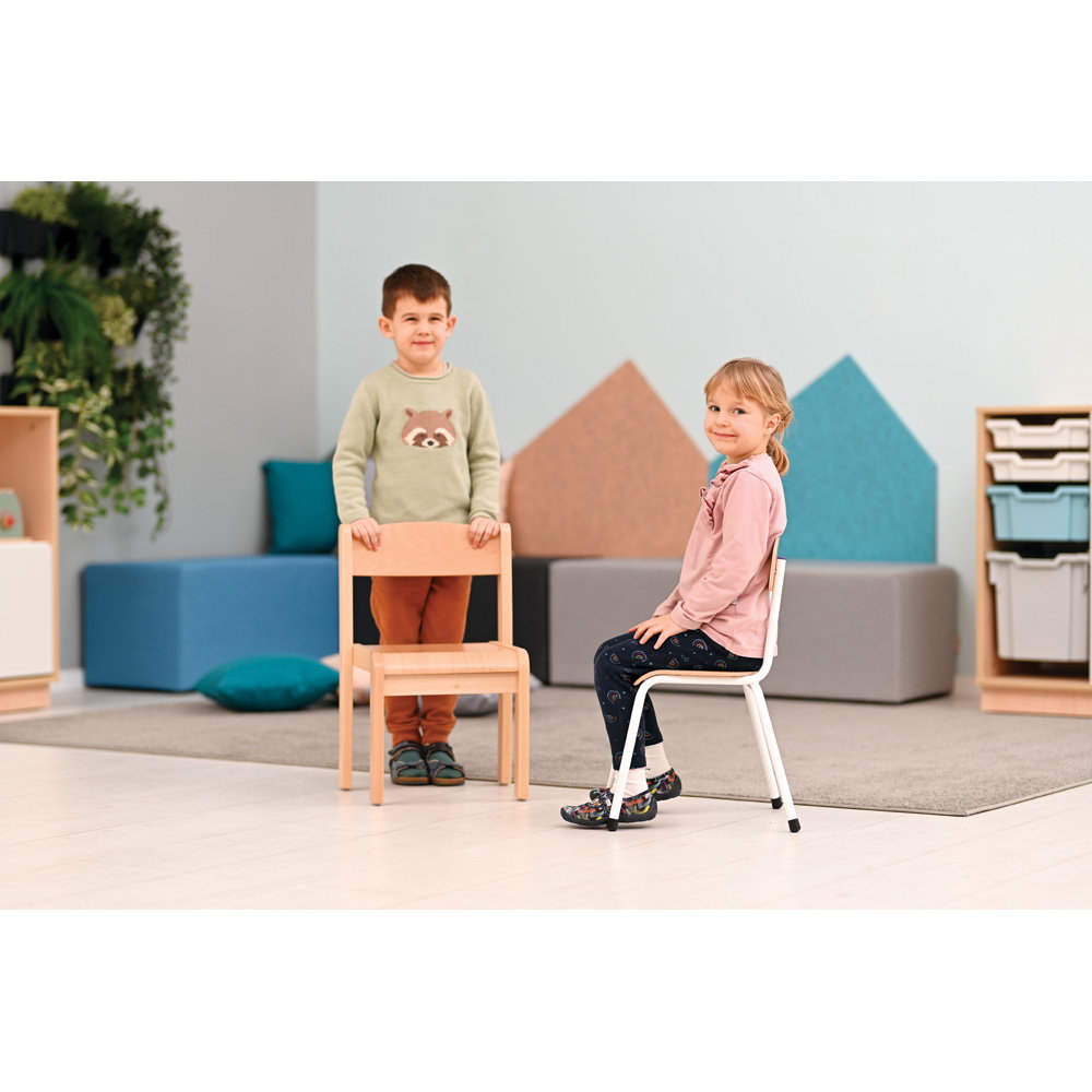 Der Stapelstuhl Alex mit Filzgleitern, Buche ist die ideale Sitzlösung für Kindereinrichtungen wie Kindergärten, Krippen und Schulen. Mit seinem robusten Gestell aus lackiertem Buche-Massivholz und einer durchdachten, ergonomischen Konstruktion bietet er Komfort, Sicherheit und Funktionalität – abgestimmt auf die Bedürfnisse wachsender Kinder. Die robuste Bauweise und das platzsparende, stapelbare Design machen den Alex-Stuhl nicht nur praktisch, sondern auch langlebig und vielseitig einsetzbar. Dazu tragen die umweltschonenden Materialien und die pflegeleichte Lackierung aus Acryllack auf Wasserbasis bei.