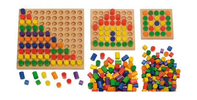 - Training der Hand-Auge-Koordination: Das Greifen und Platzieren der kleinen Steckelemente erfordert Geschicklichkeit und präzise Bewegungen. Dadurch wird die Feinmotorik gefördert.